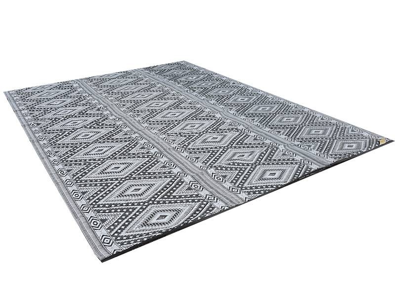 Sehr großer Außenteppich aus Kunststoff in kühlen, robusten Farben Schwarz, Weiß und Grau, mit einem modernen grafischen Muster in Indien gewebt. Dieser praktische Teppich schmückt auf einmal eine sehr große Fläche, da er ganze 270 x 360 cm misst und komplett faltbar ist. Nehmen Sie ihn mit zum Campingplatz für das Zelt, und es sieht sofort aus wie ein gemütlicher Ort, der zu vielen geselligen Tagen im Sommer einlädt.