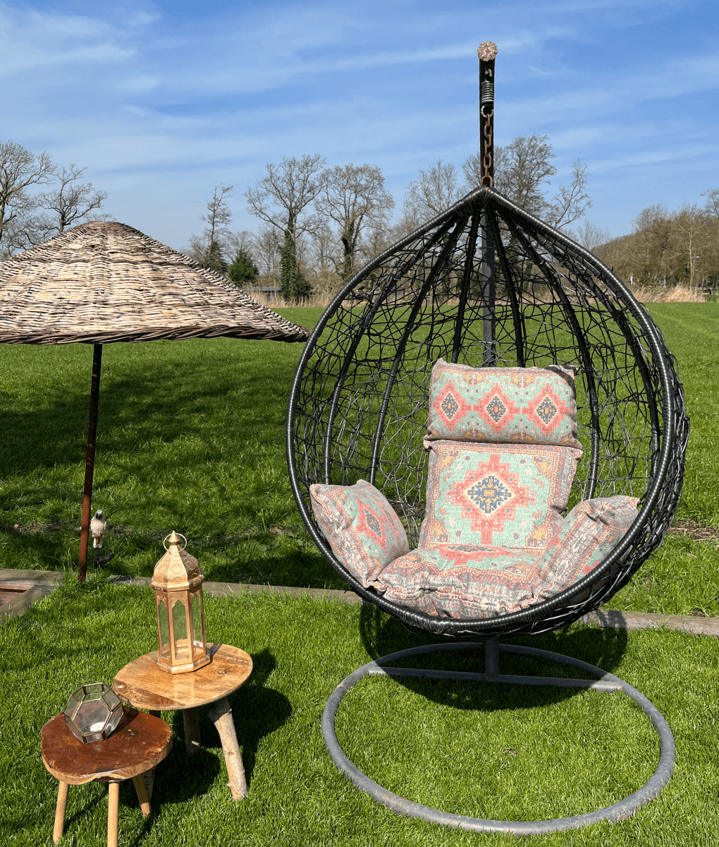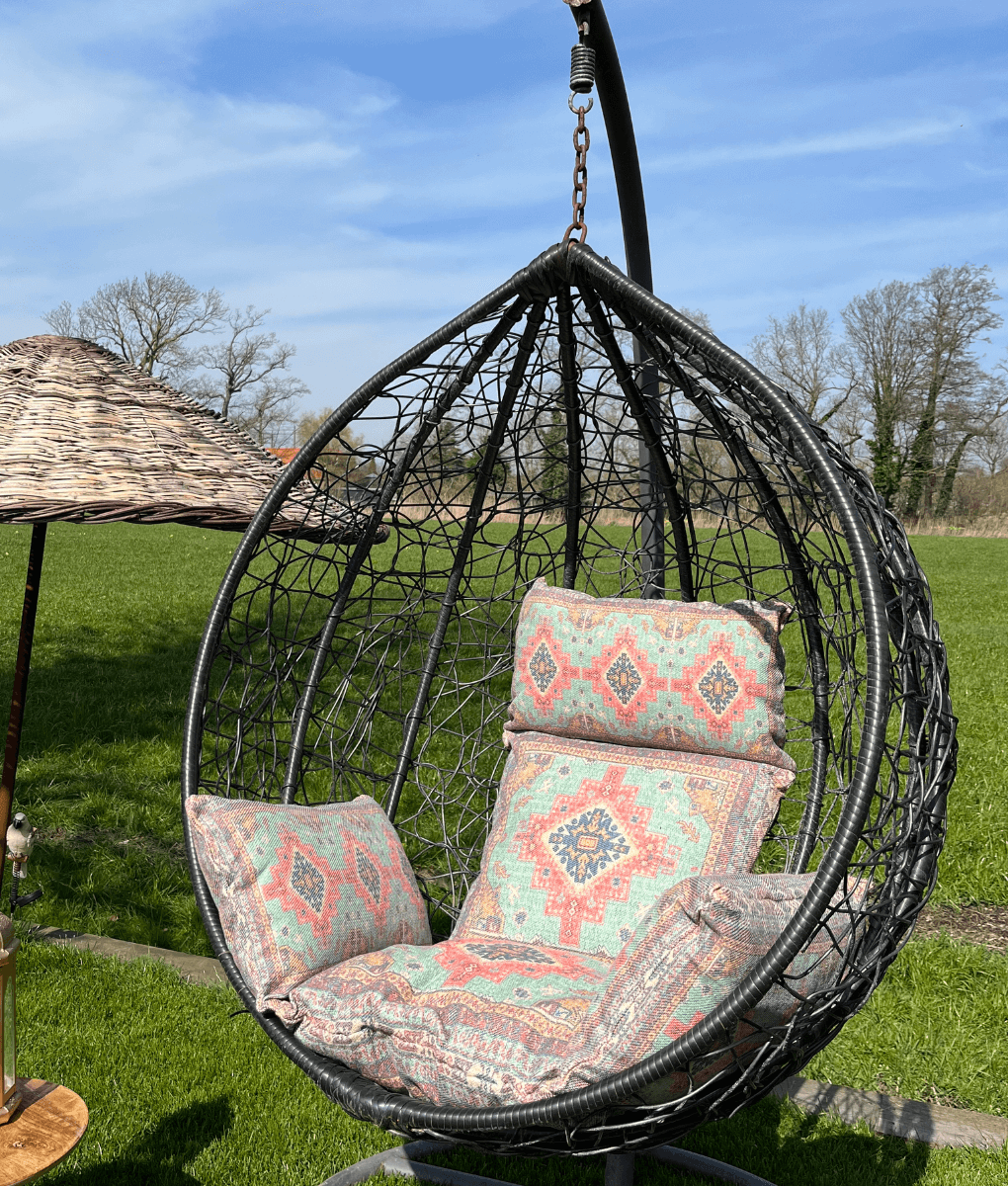 Ein wunderschönes Kissen für den Hängesessel. Solche trendigen Hängesessel sieht man natürlich überall, aber wie schön ist es, wenn darin ein fröhliches Kissen mit einem gemütlichen Muster liegt? Dieses Kissen ist mit unserem Pastel Vintage-Print versehen. Frische deinen Garten mit diesem Blickfang auf.