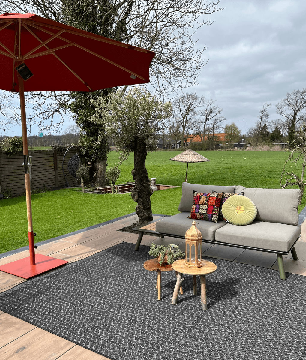 Robust und sehr luxuriös - dieses Außenteppich macht sich gut in Ihrer Lounge-Ecke im Garten. Das Muster ist ruhig und der Teppich hat einen Jute-Look und -Feel. Mit vielen Farben kannst du diesen schwarzen Lounge-Teppich kombinieren und wirklich ein Statement in Ibiza-Stil setzen. Wasser fällt hindurch und trocknet schnell wieder in der Sonne. In 3 Größen erhältlich und auch in neutraler Beigefarbe. Der Teppich lässt sich leicht mit Wasser reinigen und kann sowohl drinnen als auch draußen verwendet werden. Hergestellt aus umweltfreundlichen Kunststofffasern und hat einen natürlichen Glanz. Bei Allergien ist auch Polypropylen eine gute Wahl, da es keine Fasern verbreitet oder Staub anzieht.