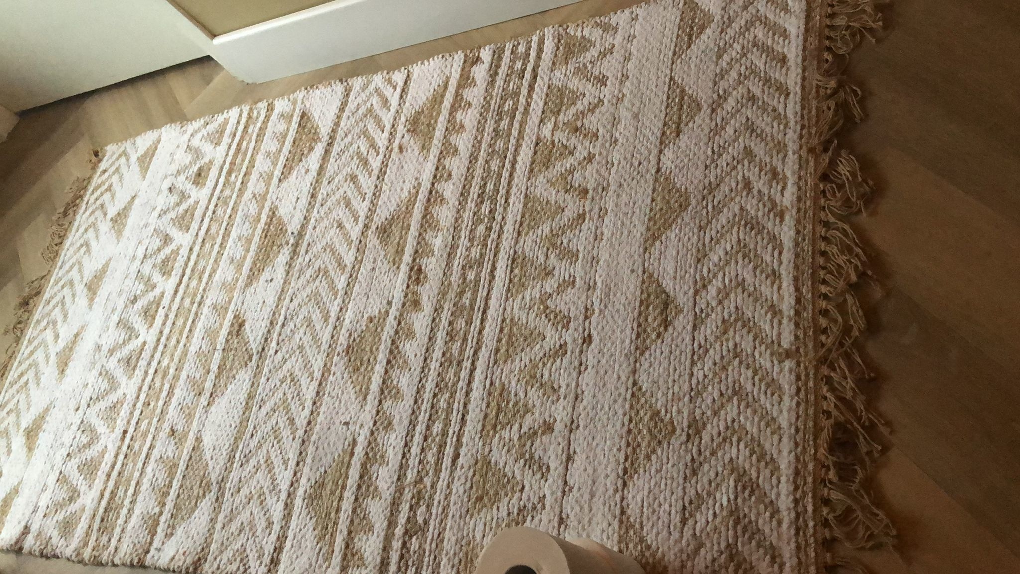 Das Muster ist ein weißer Azteken-Print, der auf das Jute aufgebracht ist. Dadurch erhält der Teppich eine einzigartige Note, ohne zu auffällig zu sein. An den Enden des Teppichs befinden sich Fransen, die das Gesamtbild abrunden!