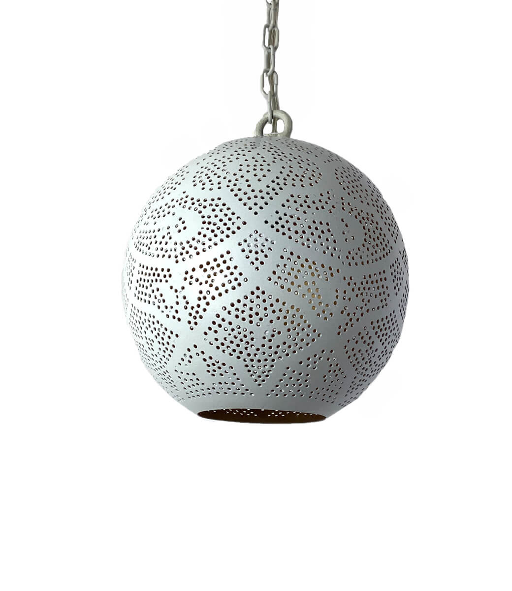 Kleine Globe Hängelampe in Weiß, ideal für das Badezimmer oder nebeneinander über der Bar. Mit einer öffnung an der Unterseite, durch die das goldene Innere leuchtet. Mit schönen filigranen Mustern, wenn die Lampe am Abend eingeschaltet ist. Diese schöne filigrane Hängelampe ist in vielen Farben erhältlich, darunter Silber, Schwarz, Weiß, Gold und Kupfer.