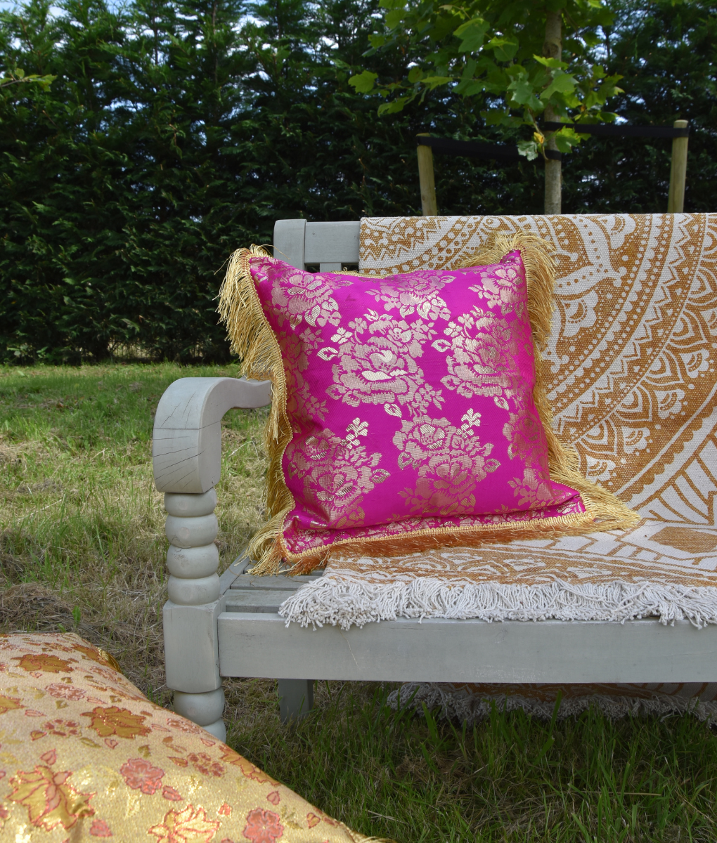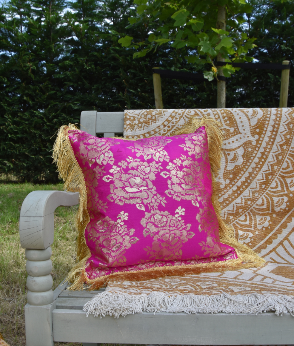 Ein wunderschönes Kissen in leuchtendem Lila/Fuchsia mit attraktiven goldenen Blumen als Muster. Ein toller romantischer Artikel für Ihr Interieur oder Ihren Garten!