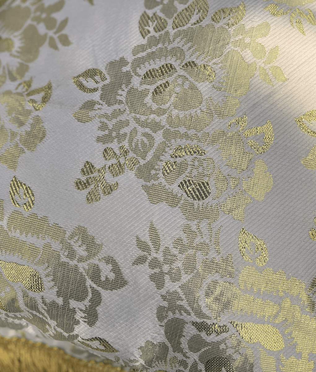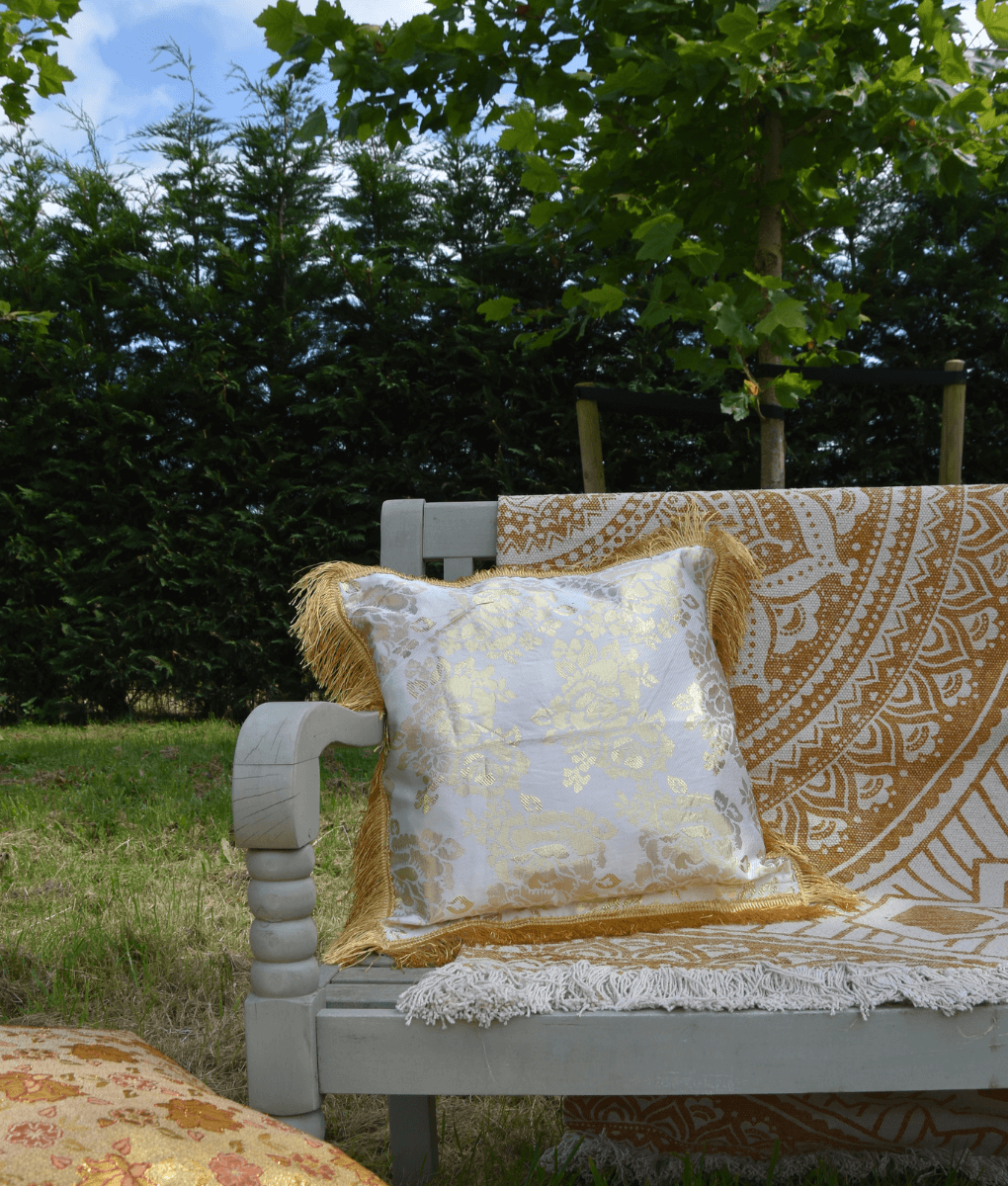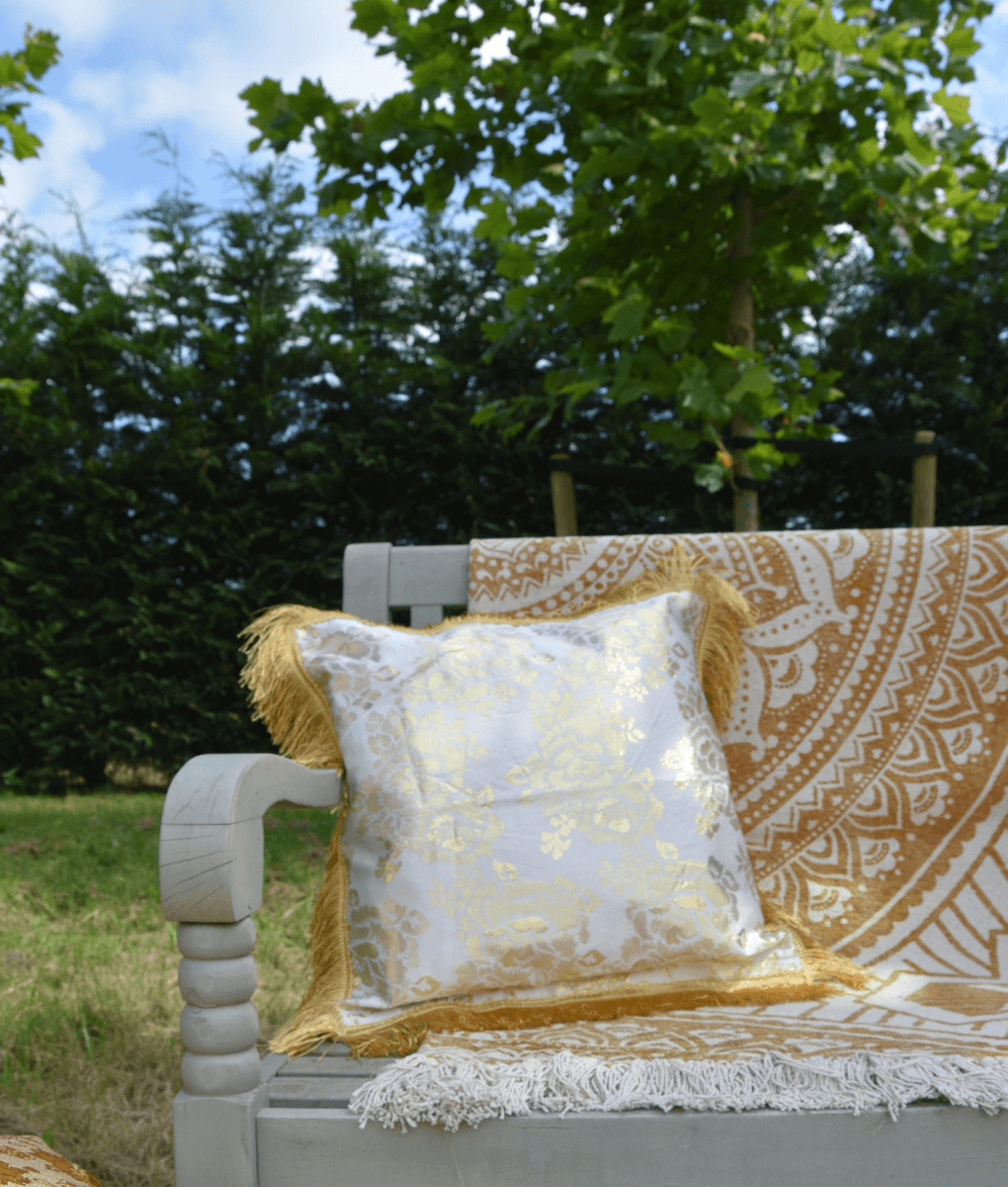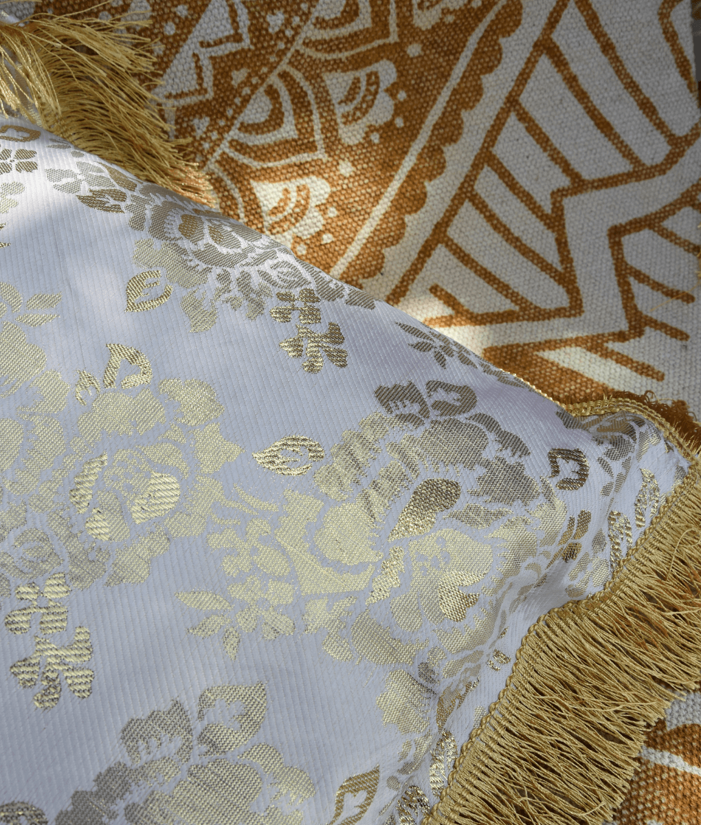Ein luxuriöses Dekokissen aus Bali. Ausgestattet mit einer weißen Farbe in Kombination mit goldenen Rosen und Fransen. Ein wunderschöner Artikel für Ihr Interieur, sowohl drinnen als auch draußen.