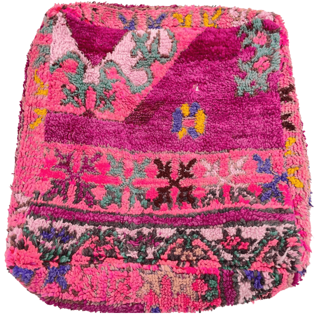 Stimmungsvoller marokkanischer Sitzhocker mit leuchtenden Rosatönen und gemütlichem Muster. Schön weich und ein echter Hingucker in Ihrem Interieur! Handgefertigt im Atlasgebirge.
