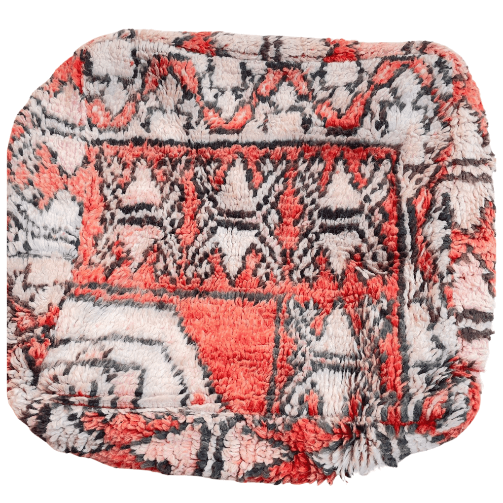 Marokkanischer Pouf mit einer warmen rot/rosa Farbe in Kombination mit weißen Akzenten. Der Pouffe hat einen hohen Flor, ist also wunderbar weich und super attraktiv! Handgefertigt im Atlasgebirge.