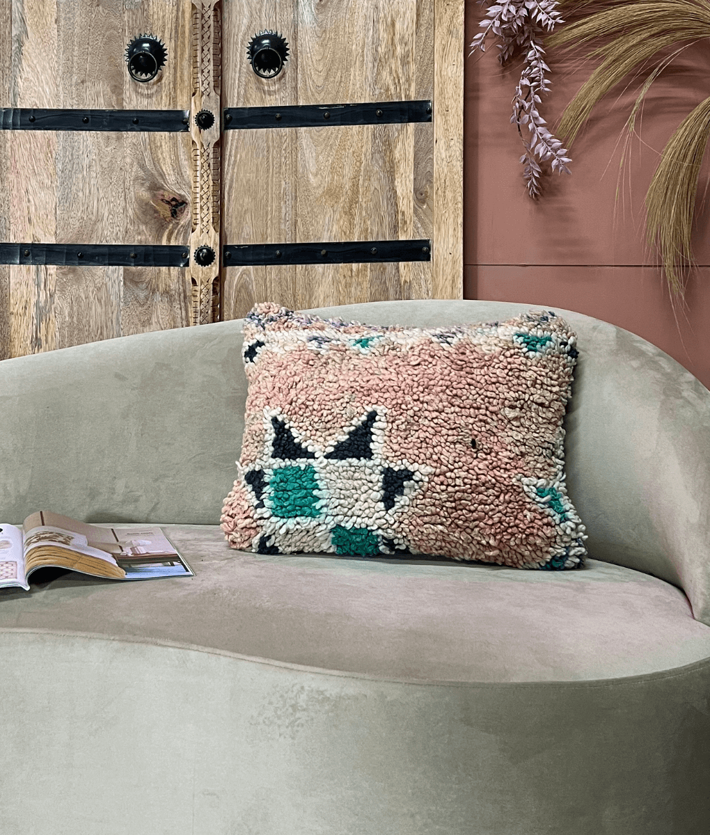 Berberkissen aus dem Atlasgebirge Marokkos. Verfügt über einen beigen Hintergrund und farbenfrohe Akzente in Form eines Sterns.Lesen Sie mehr