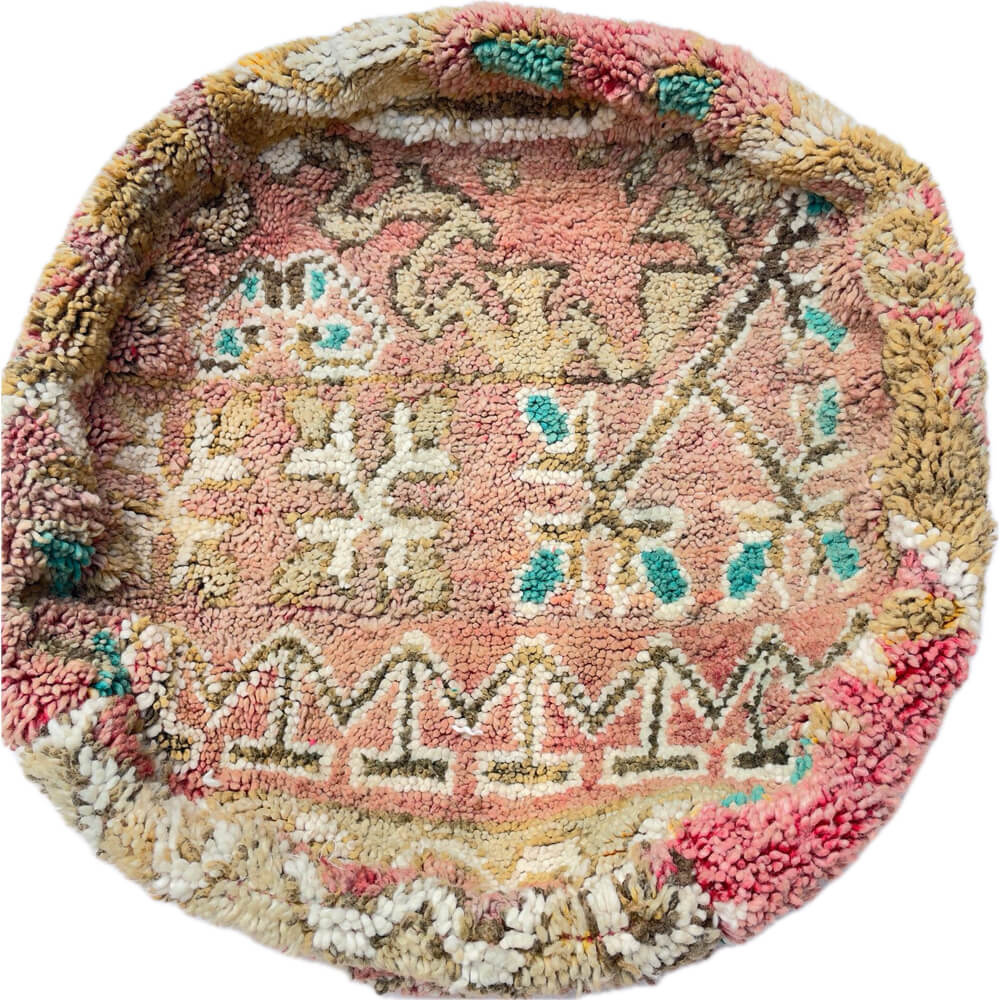 Atmosphärischer marokkanischer Ottoman in runder Form. Ausgestattet mit einem warmen Rosaton und Brauntönen. Passt voll und ganz in die heutigen Trends! Handgefertigt in Marokko aus alten Berberteppichen.
