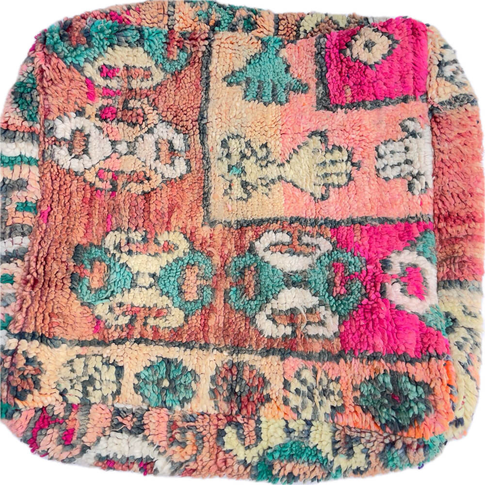 Atmosphärischer marokkanischer Ottoman mit warmen rosa und orangefarbenen Details. Eine fröhliche Ergänzung für Ihr Interieur! Handgefertigt aus alten Berberteppichen in Marokko.