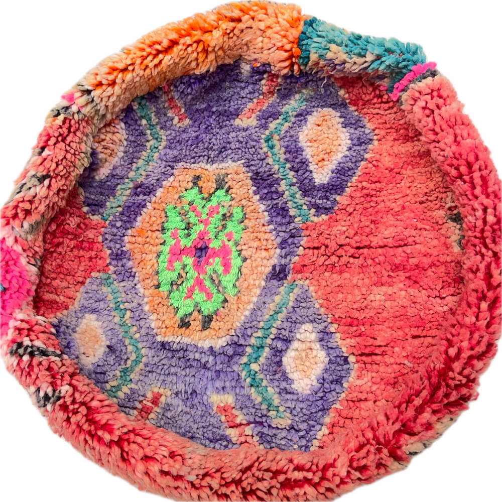 Runder marokkanischer Sitzpuff mit fröhlichen Pastellfarben. Schön weich und passt perfekt zu den heutigen Trends! Handgefertigt im Atlasgebirge in Marokko.