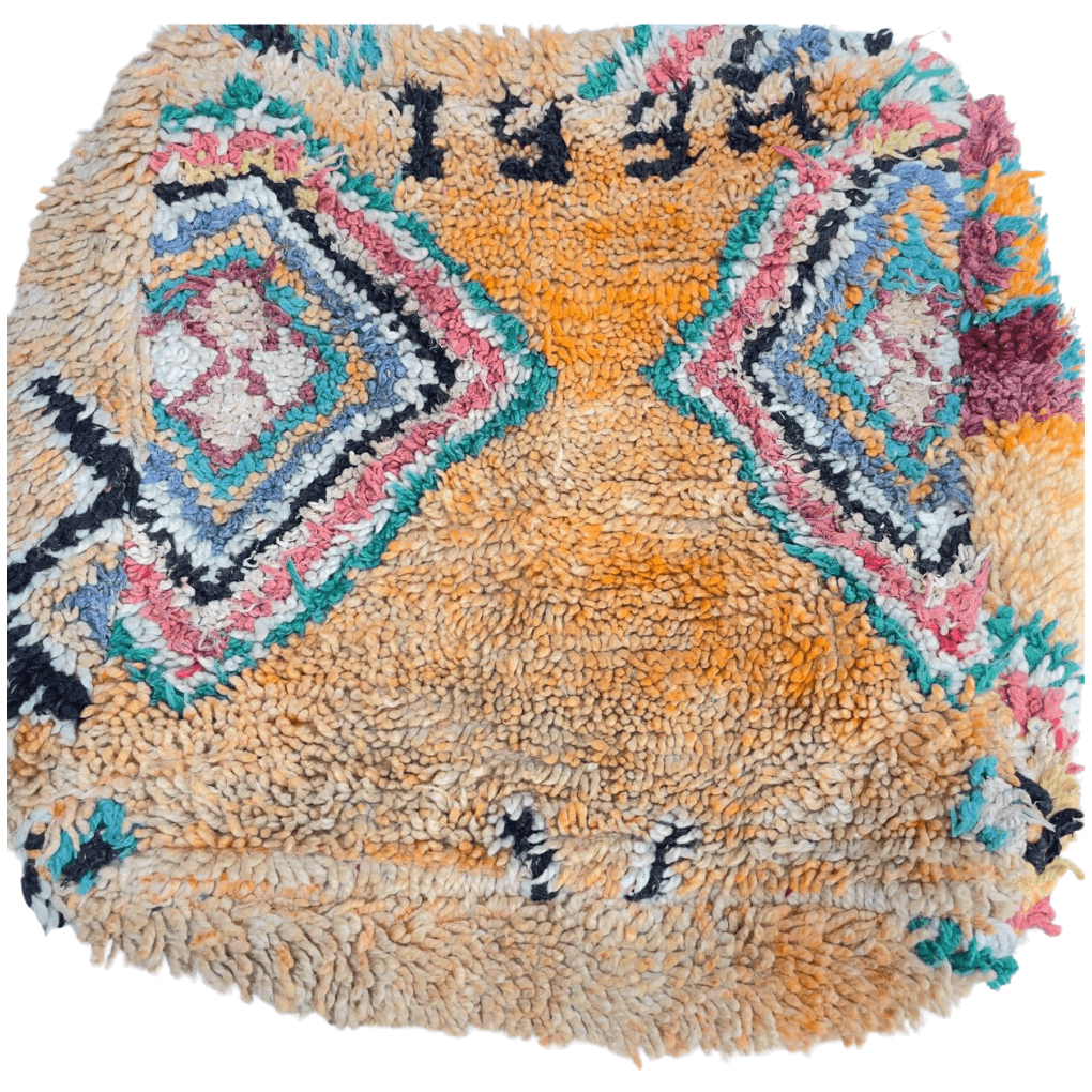 Wunderschöner marokkanischer Berber-Hocker mit zartrosa Hintergrund und einem coolen Muster aus sanften Pastellfarben. Eine echte Bereicherung für Ihr Wohnzimmer!Lesen Sie mehr