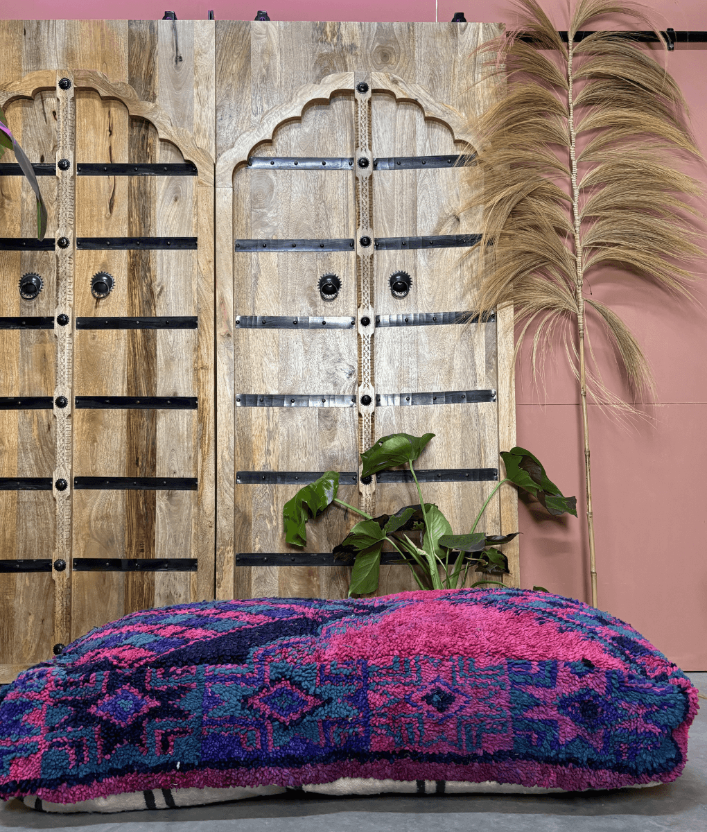 Marokkanischer XL-Hocker mit tiefvioletter Farbe und durchgehenden Rosa-/Blautönen. Die Farbkombination ergibt einen unglaublich coolen Effekt! Aufgrund der Größe des Poufs können Sie ihn mit einigen schönen Kissen in eine schöne Bank verwandeln, wunderbar weich!