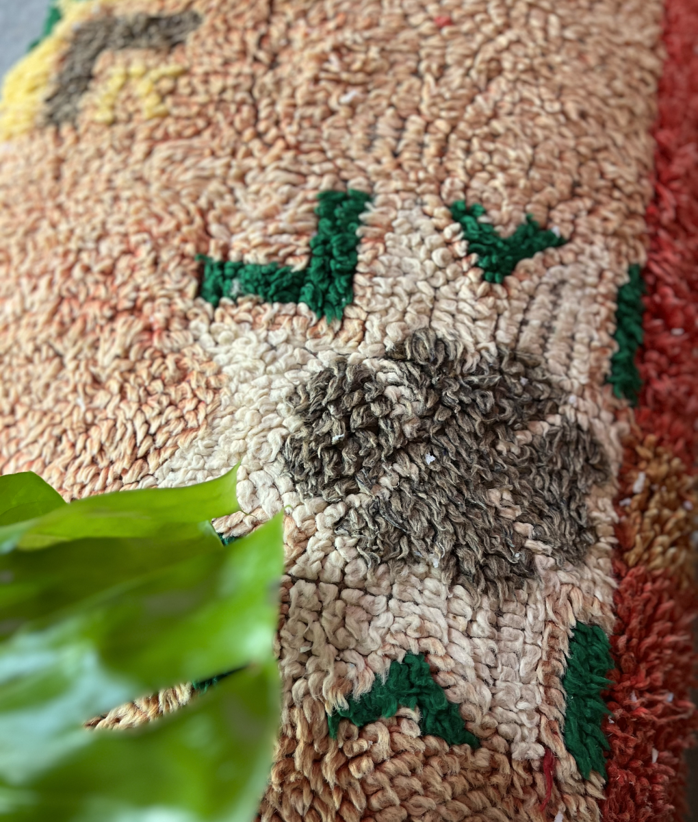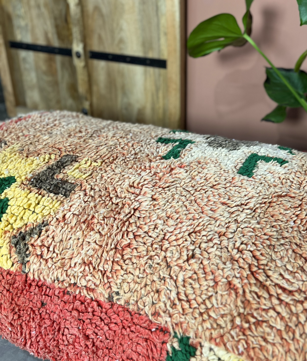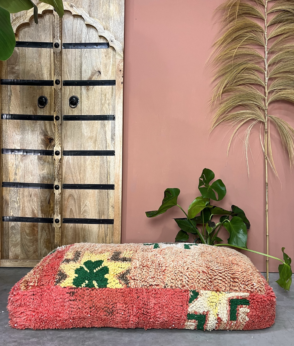 Ein bunter marokkanischer XL Pouf mit roten, gelben und grünen Details und einem hellrosa Hintergrund. Ein bequemer Pouf, und durch die Größe kannst du ihn auch als Bank mit ein paar Kissen nutzen! Handgefertigt im Atlasgebirge.