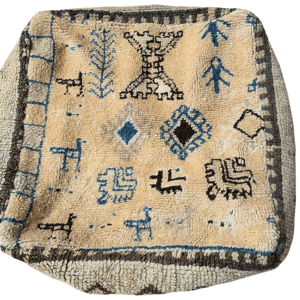 Gemütlicher marokkanischer Pouf in sanftem Orange mit grünen Details. Ein echter Blickfang in deinem Interieur! Hergestellt aus alten Berber-Teppichen.