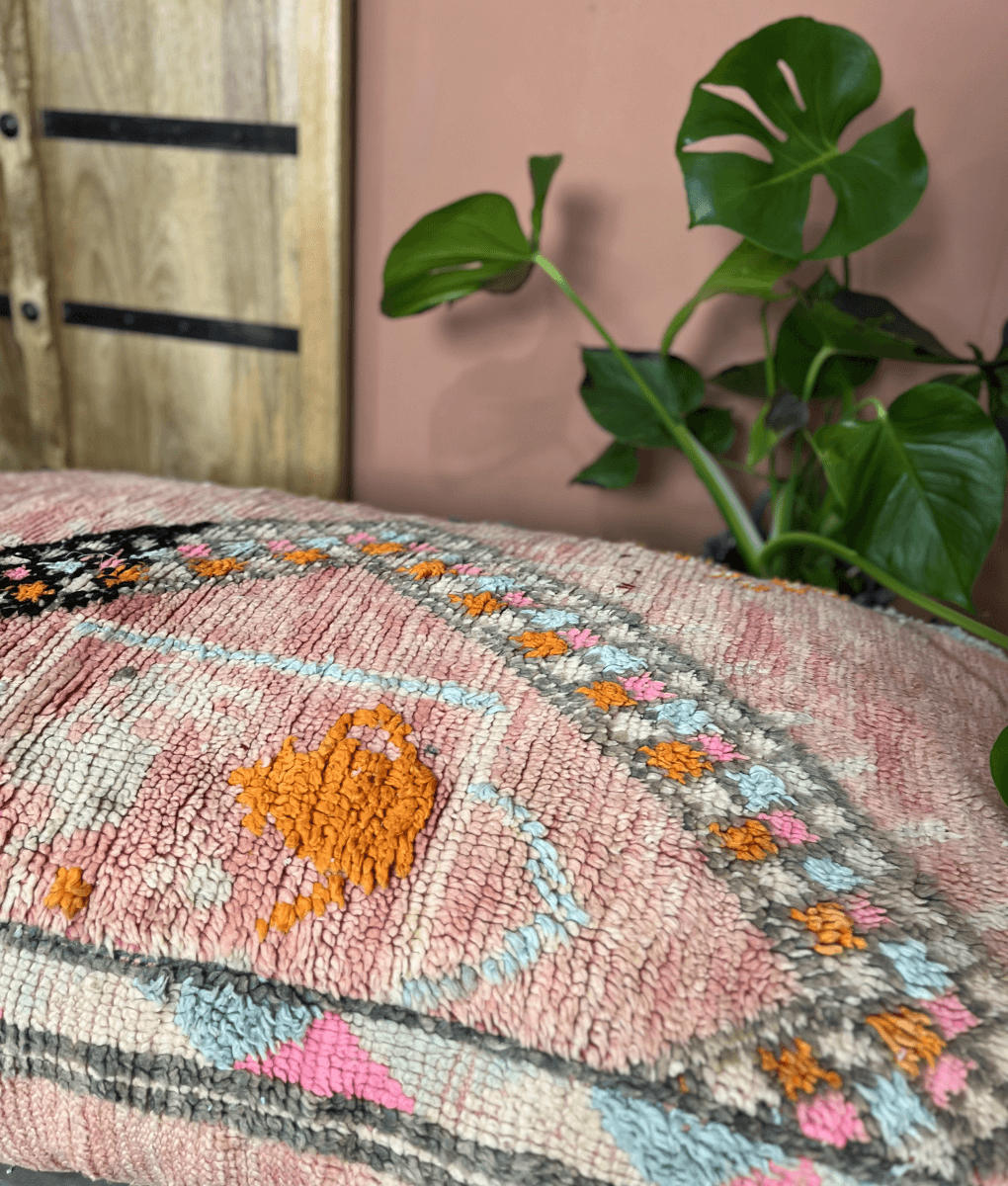Ein wunderschöner marokkanischer Pouf in fröhlichen Farben und mit einem tollen Muster. Der Pouf ist schön groß und kann daher auch als Bank mit gemütlichen Kissen verwendet werden! Handgefertigt in Marokko.
