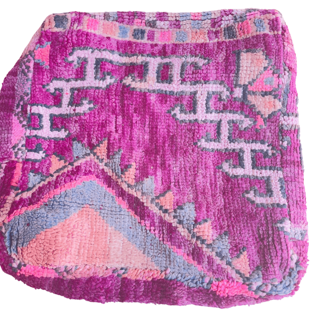 Atmosphärischer marokkanischer Ottoman mit coolem lila Aufdruck mit Details in Orange, Rosa und Beige. Passt voll in die aktuellen Trends und ist wunderbar weich! Handgefertigt in Marokko.