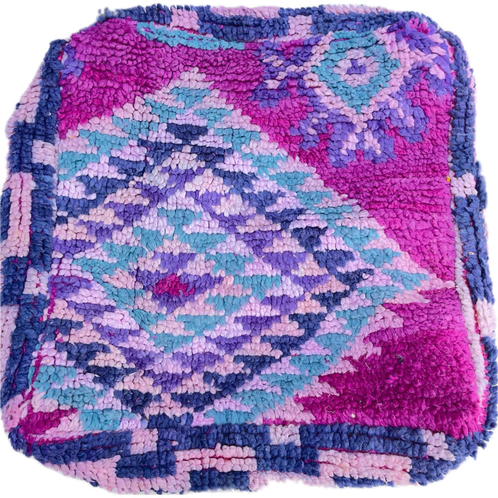 Atmosphärischer marokkanischer Ottoman mit fröhlichen Farben und coolem Motiv! Schön weich und sehr gemütlich zu Hause. Handgefertigt aus alten Berberteppichen im Atlasgebirge Marokkos.