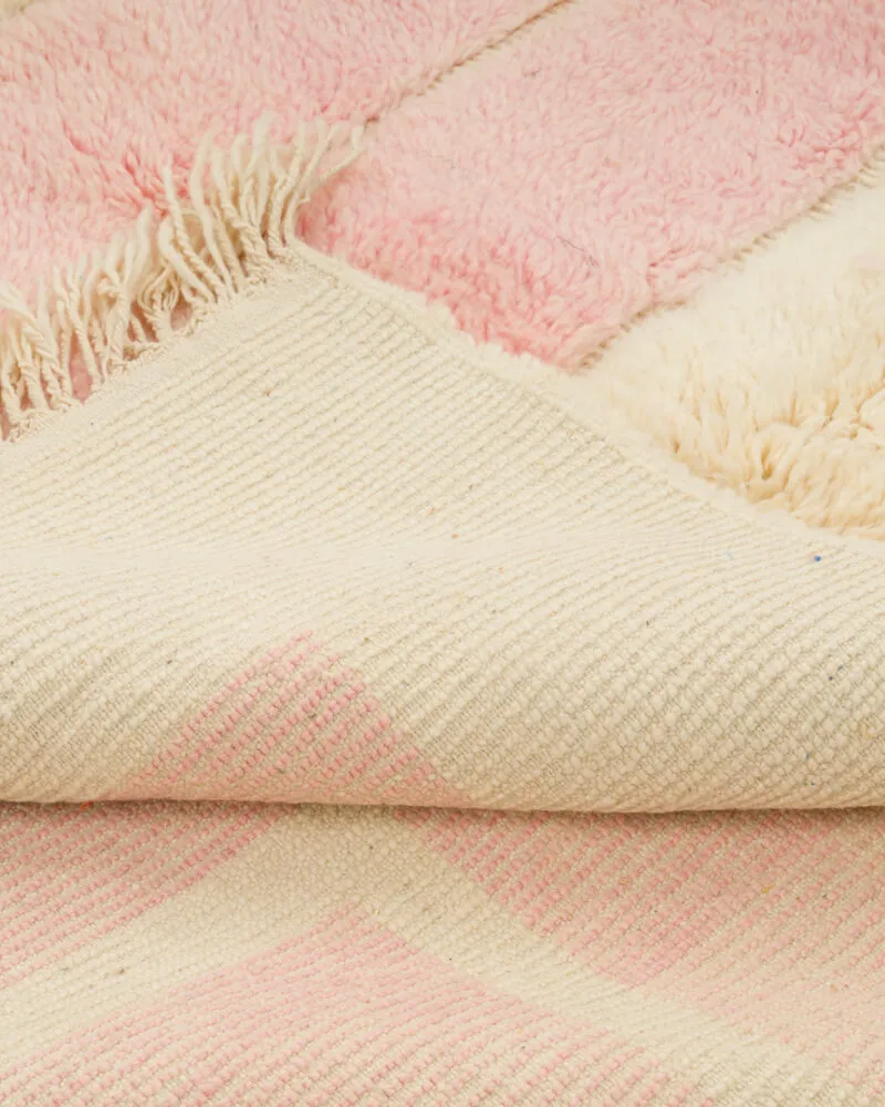 Stimmungsvolles marokkanisches Beni Mguild Teppich in einem wunderschönen sanften Rosaton mit schönen Details. Ein echtes Vintage-Teppich, handgefertigt im Atlasgebirge von Marokko.