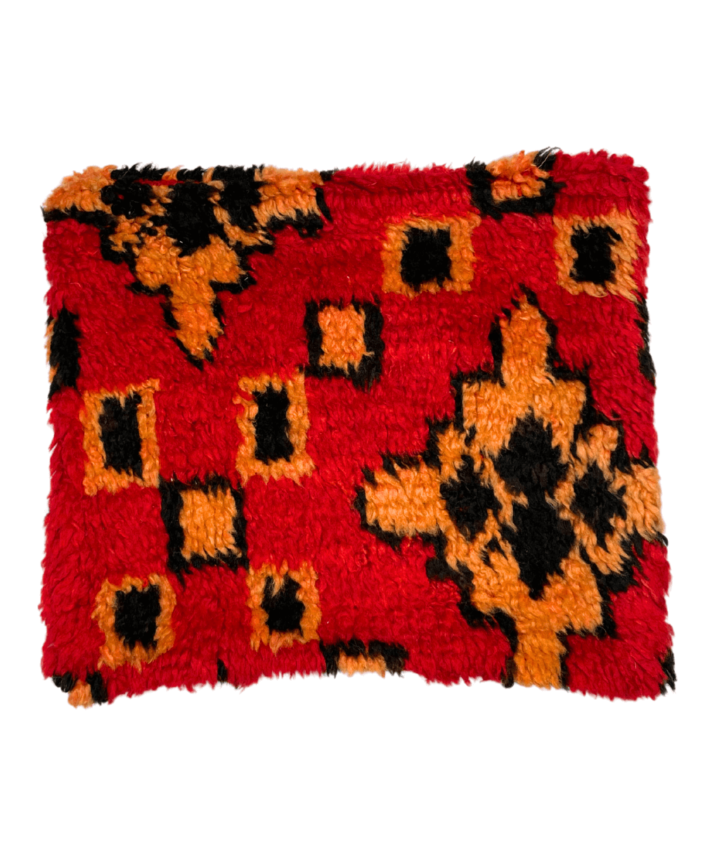 Fröhliches marokkanisches Kissen mit leuchtend roter Farbe und fröhlichem, farbenfrohem Aufdruck. Ein echter Hingucker für das Sofa!