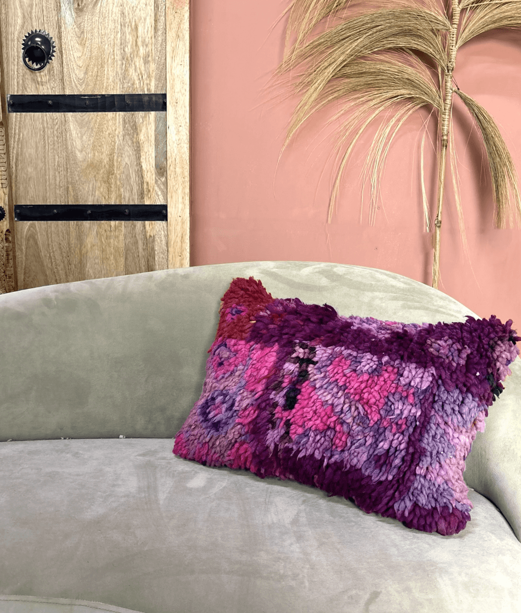 Markantes marokkanisches Kissen in einem warmen Lila-Ton, das durch die fröhlichen, bunten Akzente ein tolles Muster bildet! Herrlich weich auf der Couch! Handgefertigt im Atlas-Gebirge.
