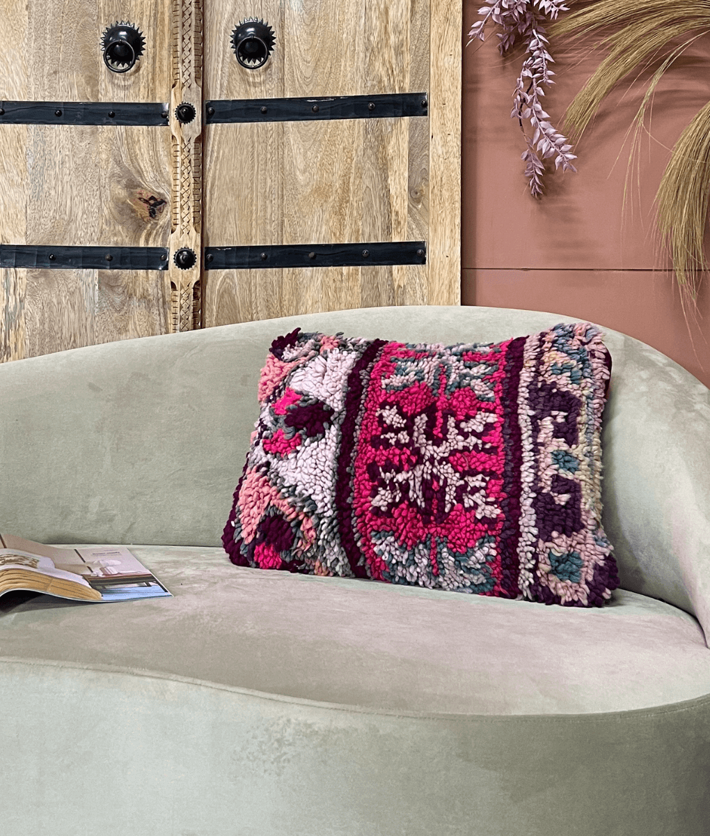 Stimmungsvolles marokkanisches Kissen mit tiefvioletter Farbe und weiteren farbenfrohen Details. Ein echter Hingucker und schön weich auf der Couch!Lesen Sie mehr