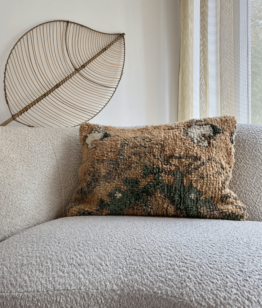 Marokkanisches Kissen 'Lizzy' mit einem fröhlichen Muster in Farben wie Grün, Orange, Beige und Grau. Herrlich weich für das Sofa! Hergestellt aus alten Berber-Teppichen.