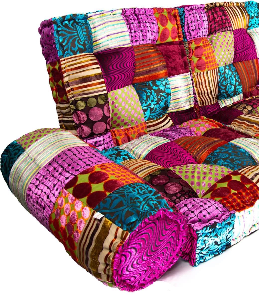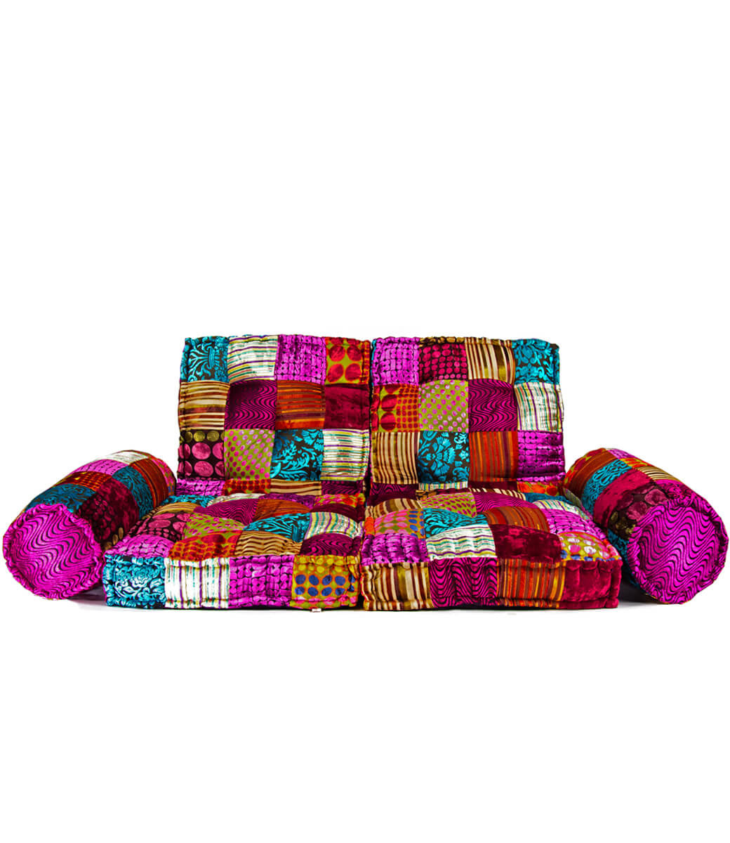 Was für eine komfortable Bank! Herrlich weicher Samt in vielen Farben, die zusammen eine gemütliche bunte Einheit bilden. Das Set besteht aus 4 Matratzen und 2 gut gefüllten Armrollen und sitzt herrlich fest, aber dennoch weich. Diese Bankenset aus Indien sieht man nirgendwo und ist einzigartig und handgefertigt aus Samtpatchwork-Stoffen. In verschiedenen Farben erhältlich und ideal für eine Palettenbank mit Armlehnen oder natürlich auf dem Boden als Loungebank.