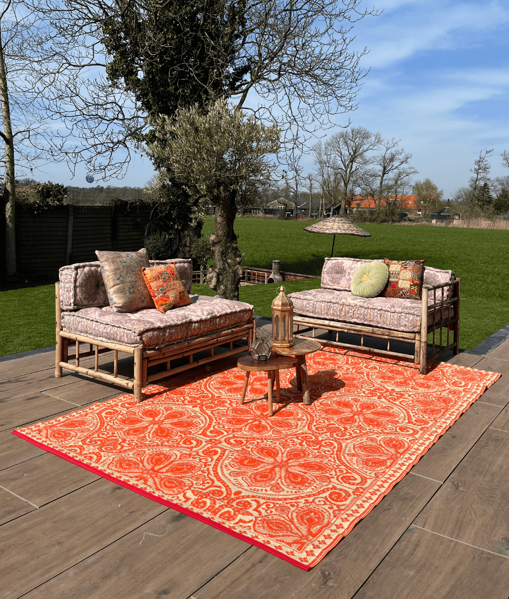 Melierter Outdoor Teppich in warmer, sonniger Orangenfarbe mit Weiß, speziell für den Einsatz im Freien im Garten, in der Größe 180 x 270 mit UV-Schutz.Lesen Sie mehr