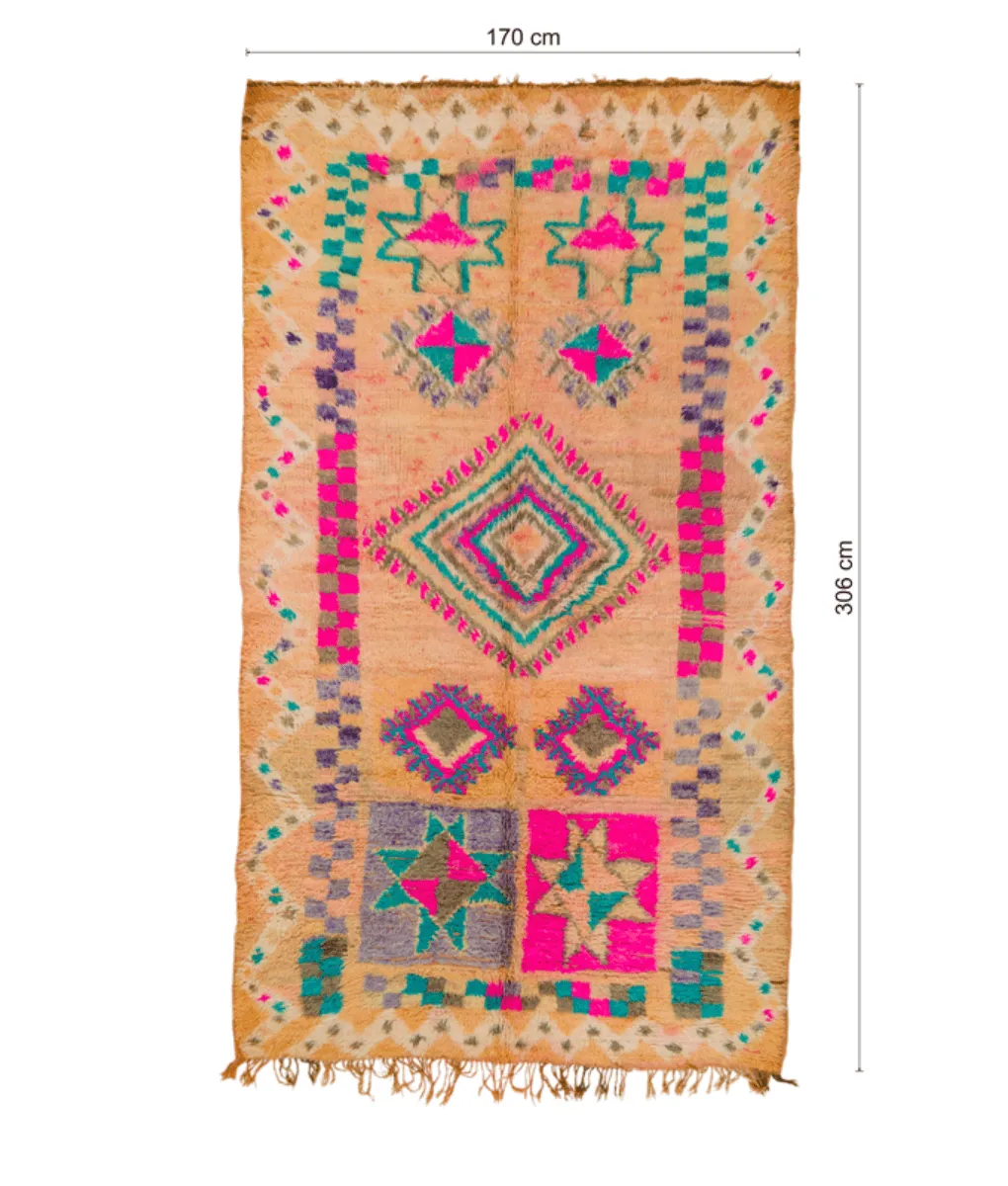 Bunter Rosa-Beige Wollteppich aus dem Atlasgebirge in Marokko, Maße 306 x 170 cm. Jeder Teppich wird von uns sorgfältig ausgewählt, gereinigt und gewaschen.