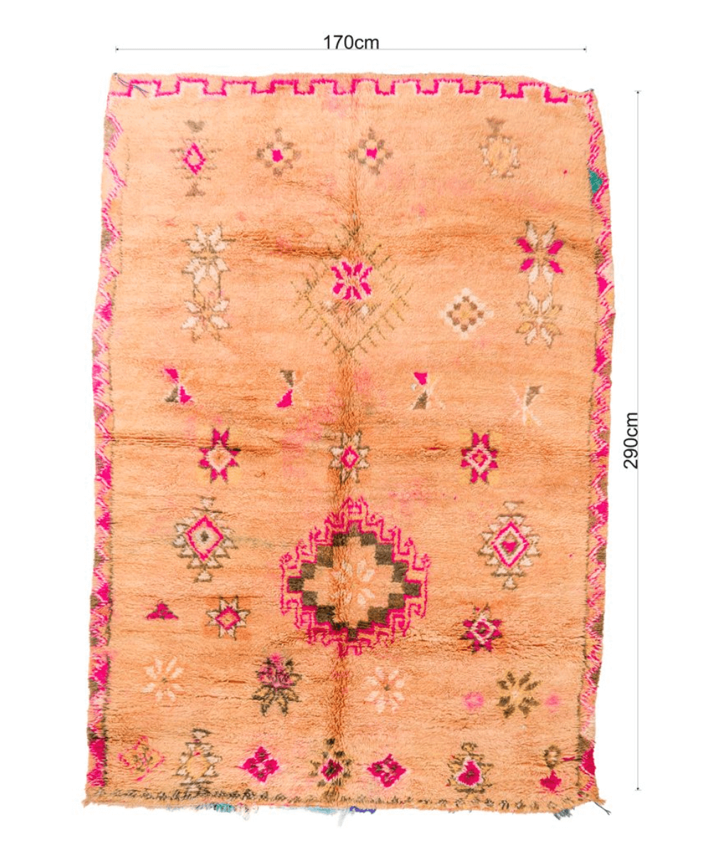 Beni Mguild-Teppich aus Marokko, verziert mit wunderschönen Pastell- und leuchtenden Farben sowie einem tollen Muster. Der Wollteppich ist handgefertigt im Atlasgebirge und ist ein Vintage-Teppich. Du hast also ein echtes Unikat in deinem Zuhause!