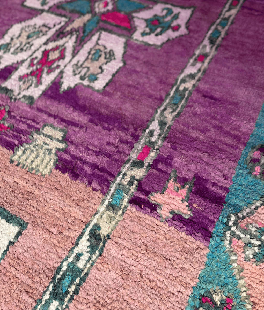 Mguild-Teppich 302 x 192 cm in Pfirsich-, Rosa- und Violetttönen aus warmer Wolle, handgefertigt von Berberstämmen aus dem Atlasgebirge in Marokko.Lesen Sie mehr