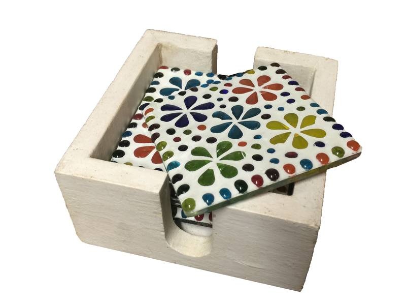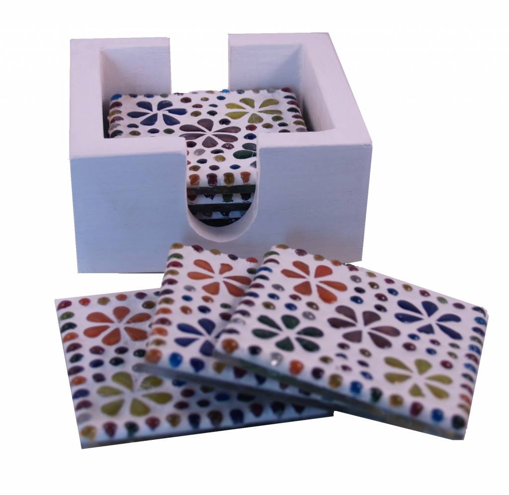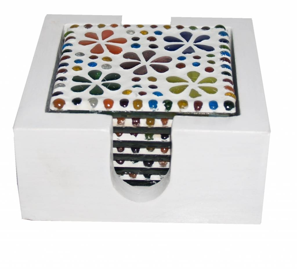 Hübsche Mosaik-Untersetzer mit mehrfarbigen Blümchenmuster und Noppen an der Unterseite, damit Ihr Tisch nicht verkratzt wird. 6 Stück pro Schachtel. Jeder Untersetzer wurde in Indien von Hand gefertigt und ist mit bunten Blumen aus Glasmosaik verziert. Gemütlich und praktisch auf Ihrem Couchtisch, um eine heiße Tasse Kaffee abzustellen. Die weiße quadratische Halterung ist aus Holz gefertigt und hat auf beiden Seiten eine Aussparung, um die Untersetzer leicht herausnehmen zu können.