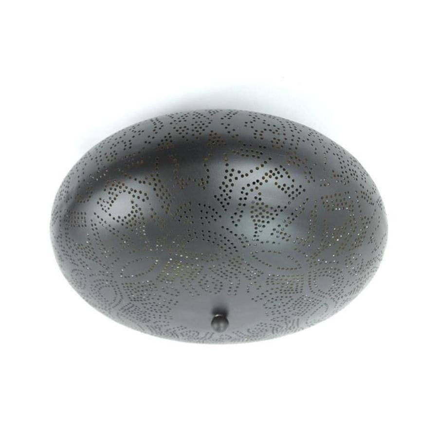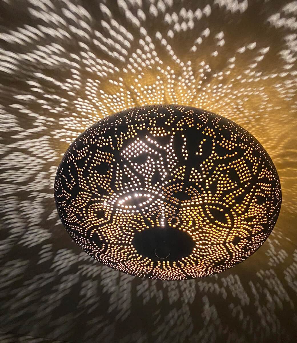 Runde filigrane Deckenleuchte, in Indien handgefertigt mit einem orientalischen Muster durch Hunderte kleiner Löcher im Metall, die von Hand perforiert wurden. Die Außenseite ist matt schwarz und die Innenseite ist goldfarben, wodurch sie so warm und stimmungsvoll leuchtet.