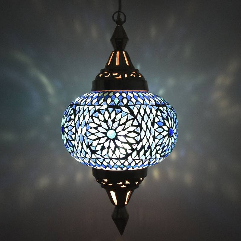 Orientalische Hängelampe aus Glasmosaik, diese funkelnde blaue orientalische Lampe aus Mosaik hat ein türkisches Design.Lesen Sie mehr