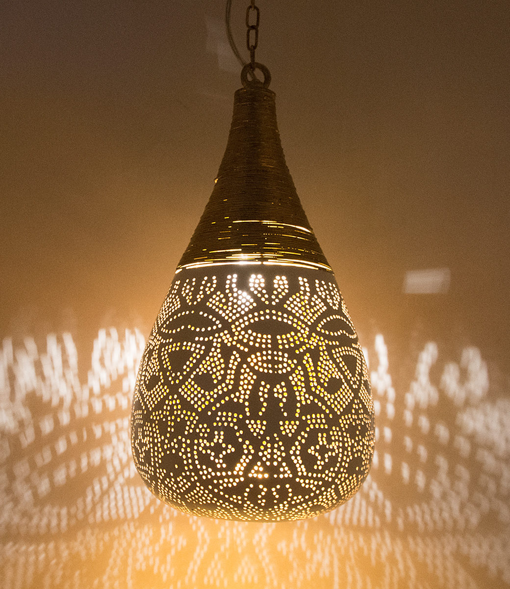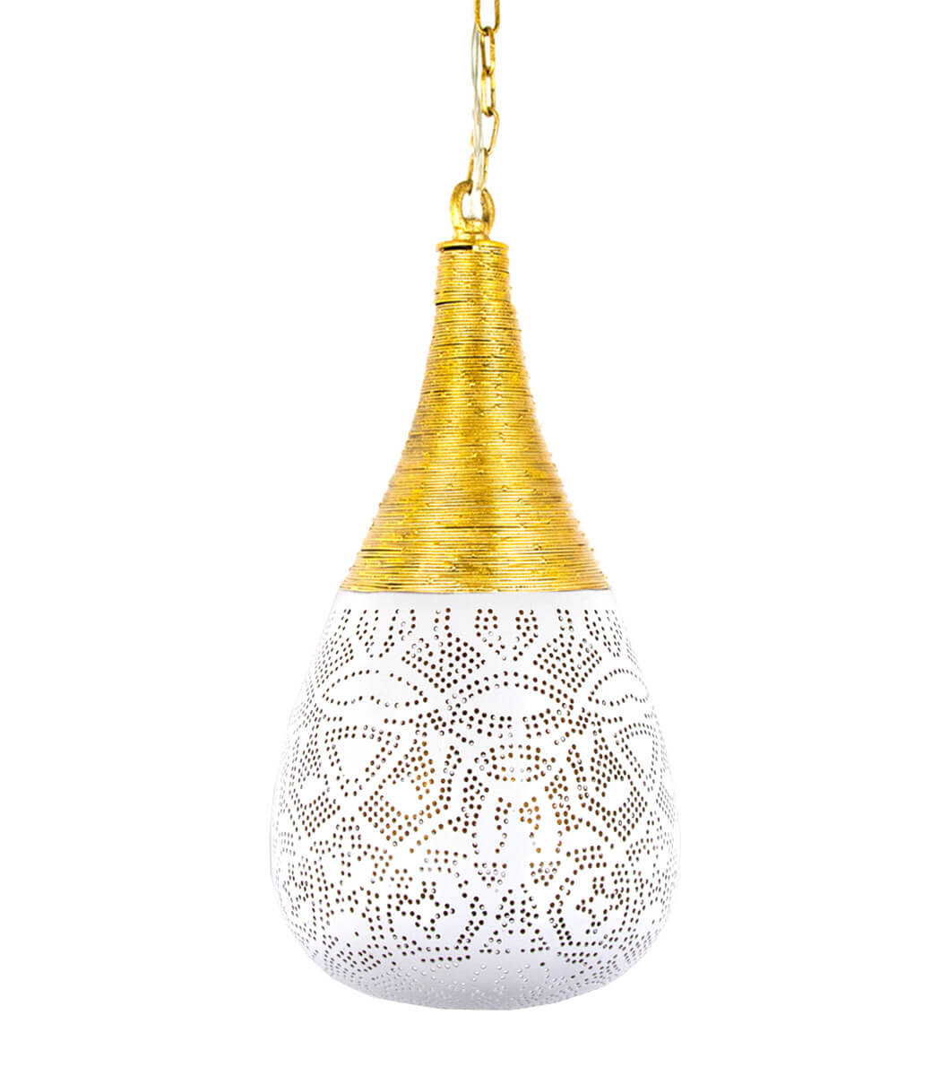Tropfenförmige Hängelampe aus Metall in weißer Farbe mit einer verspielten Oberseite aus goldfarbenem Metallfaden. Die Muster sind orientalisch und leuchten schön durch, wenn die Lampe eingeschaltet ist. Die Innenseite ist goldfarben und sorgt für warme Stimmungsbeleuchtung.