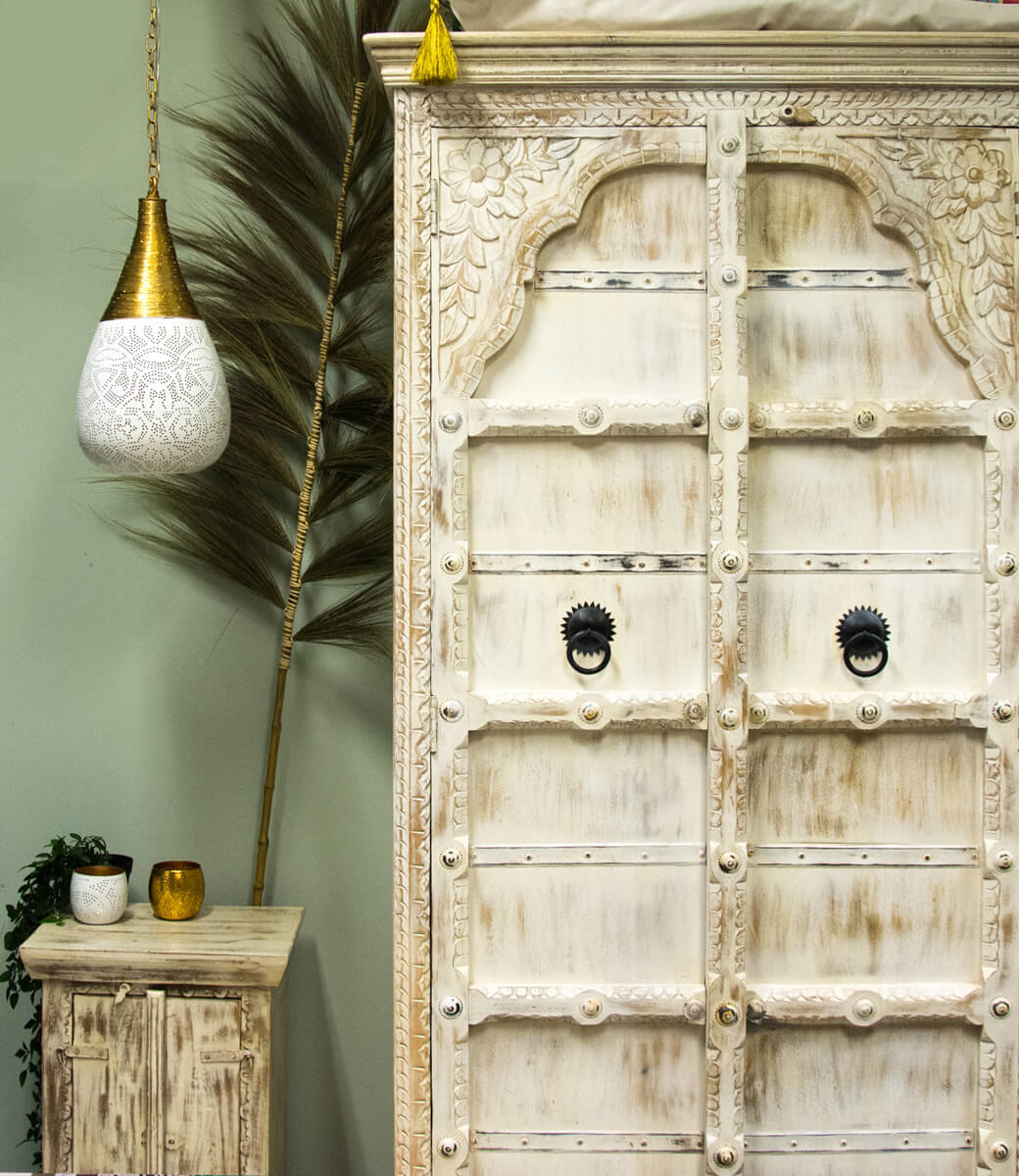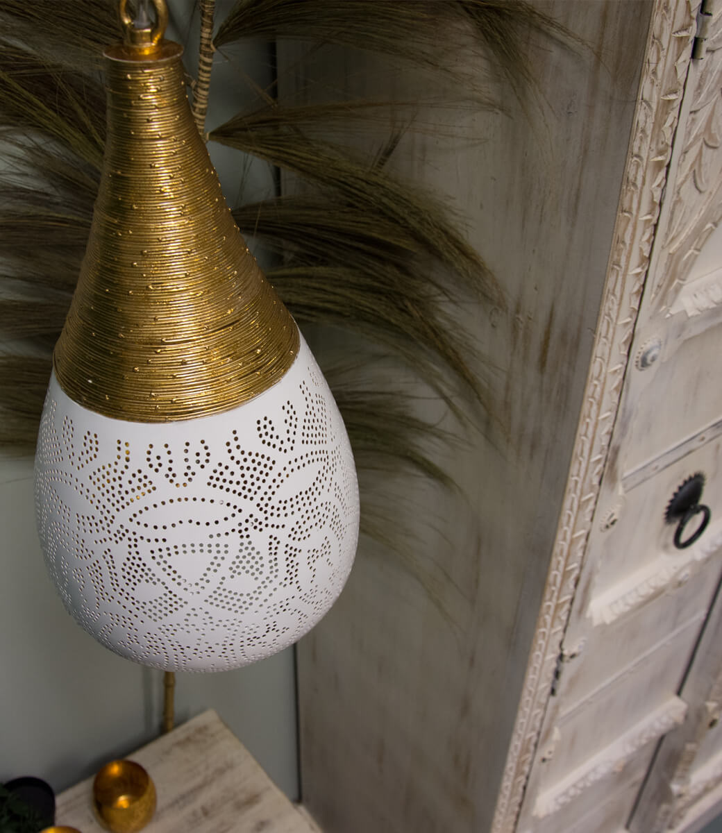 Tropfenförmige orientalische Hängeleuchte in Weiß mit gedrehtem goldfarbenem Metall als Stimmungsbeleuchtung im Wohnzimmer.Lesen Sie mehr