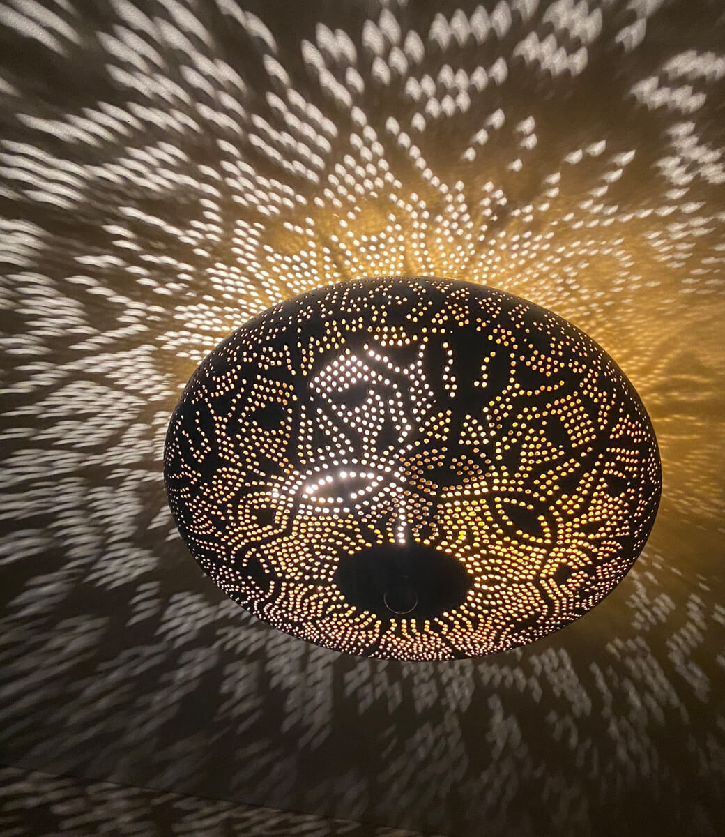 Filigrane Deckenleuchte in orientalischem Stil mit kleinen runden Löchern, die zusammen ein wunderschönes Schattenspiel an der Wand zaubern. Die Deckenleuchte strahlt warmes Licht aus, da die Innenseite goldfarben ist. Ideal zum Aufhängen im WC für eine stimmungsvolle Atmosphäre oder in einem kleinen Raum, der etwas mehr Atmosphäre vertragen kann.