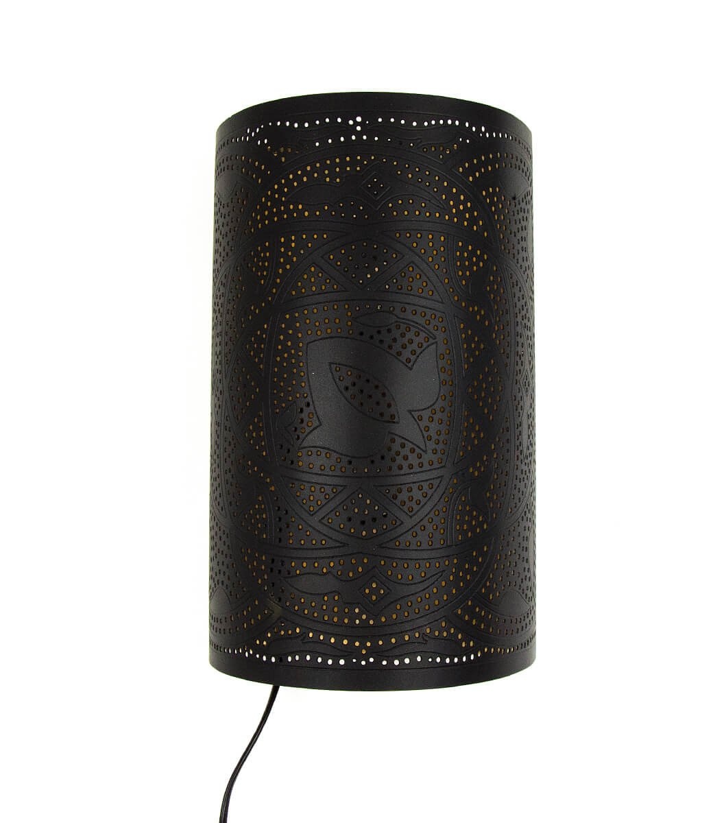 Zylindrische Wandleuchte in mattem Schwarz mit schönen orientalischen Mustern, die in das Metall eingeschnitten sind, sodass das Muster auch tagsüber sichtbar ist. Es gibt Hunderte von Löchern, die abends ein schönes orientalisches Muster erzeugen. Die Lampe spendet warmes, stimmungsvolles Licht, da die Innenseite goldfarben ist.