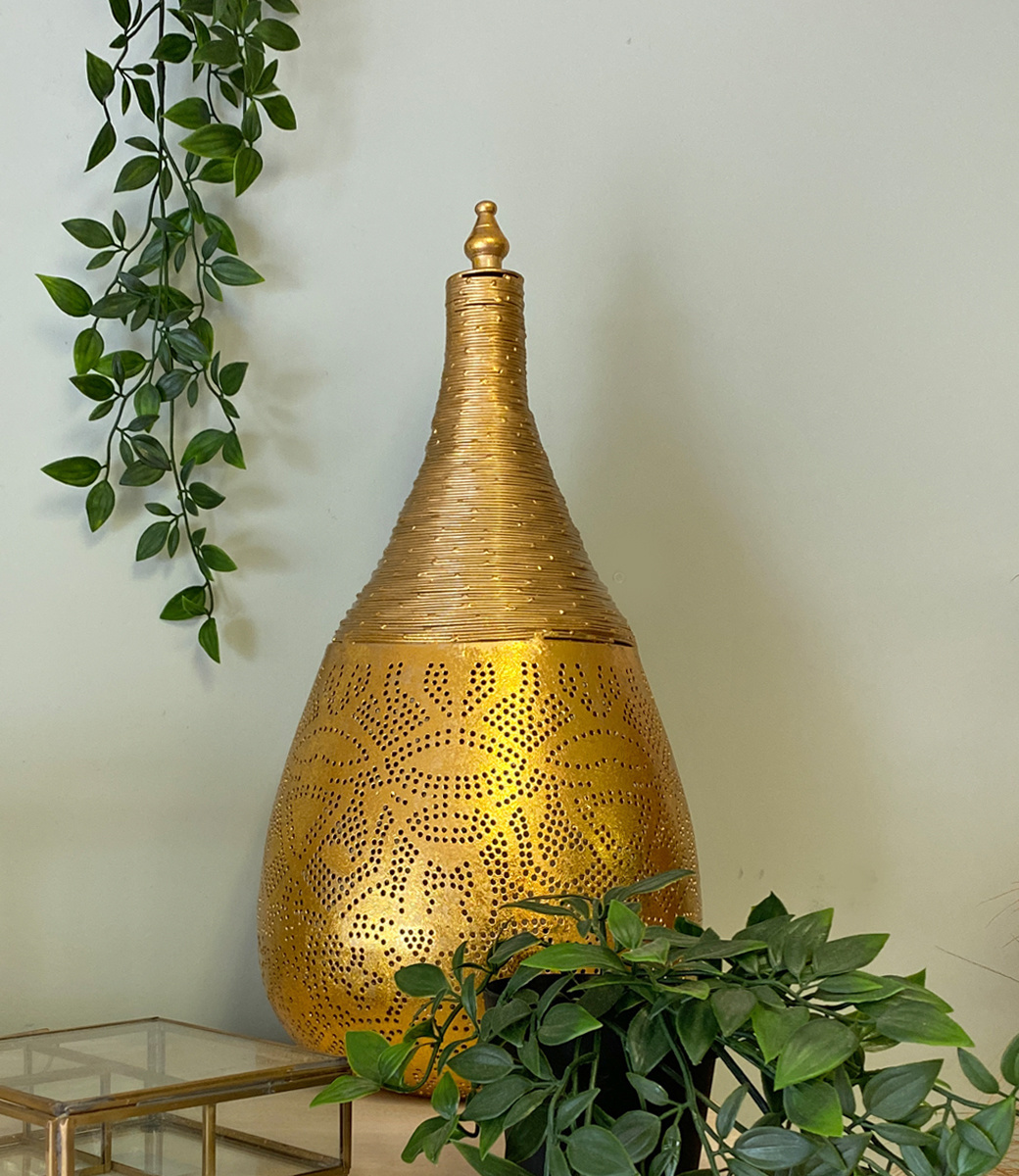 In einer vintage-goldenen Farbe präsentiert sich diese authentisch orientalische Tischlampe in Form einer großen Träne, mit orientalischen Formen am unteren Rand durch kleine Punkte. Zusammen erzeugen sie ein sehr schönes Licht, wenn die Tischlampe im Dunkeln eingeschaltet ist. Die Oberseite besteht aus gedrehtem Metall, was dieser Lampe eine aufregende Wendung verleiht. Ein wirklich verzauberndes Stück für Ihr Interieur.