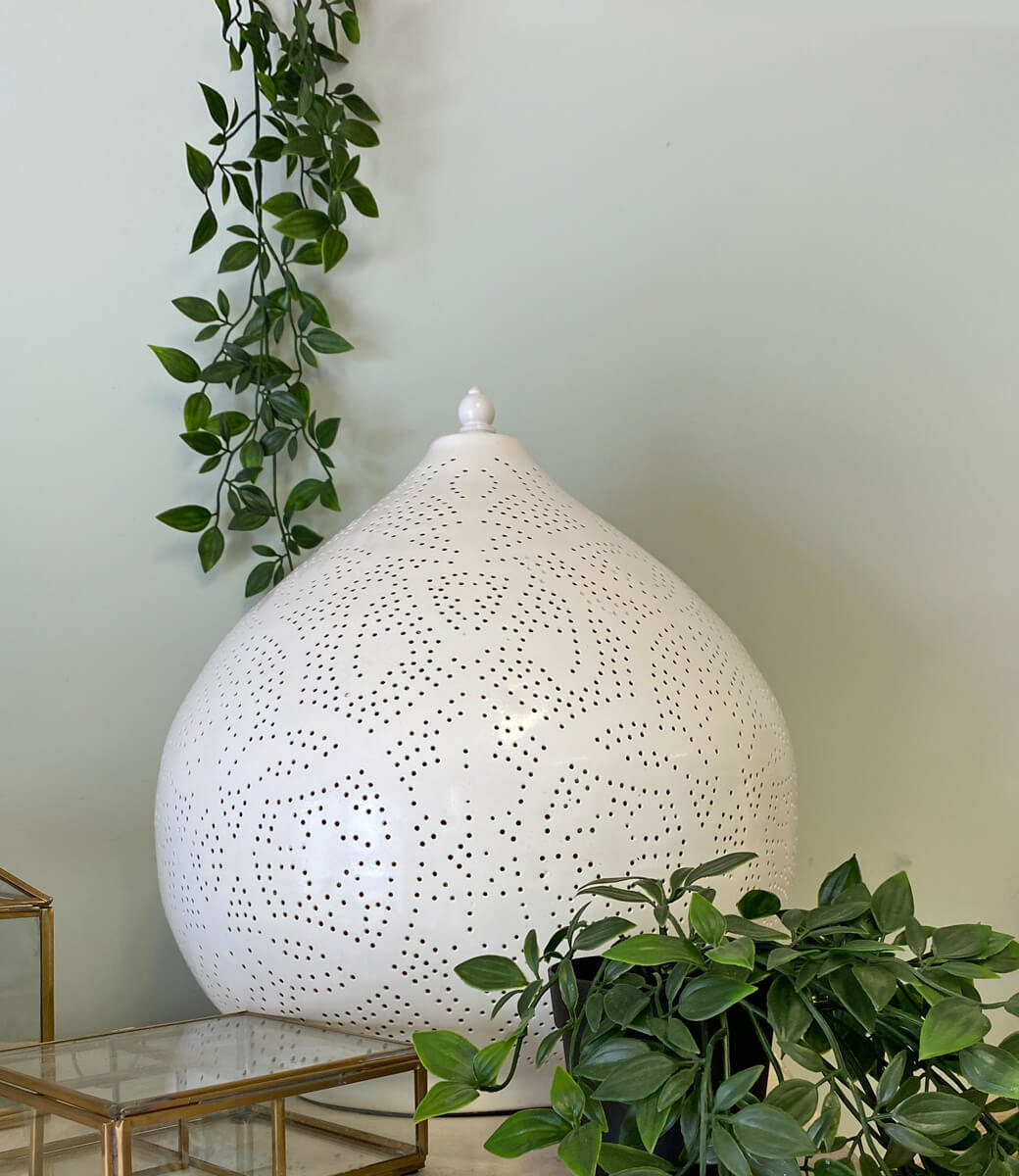 Weiß ist neutral und kann in nahezu jedem Interieur verwendet werden. Die Innenseite ist goldfarben, was für ein schön atmosphärisches Licht sorgt. Oben hat die Lampe eine elegante Spitze, die ihr diesen charmanten orientalischen Stil verleiht. Die Lampe ist auch aus Metall gefertigt und benötigt keine Wartung, nur gelegentlich abstauben, also sehr praktisch.