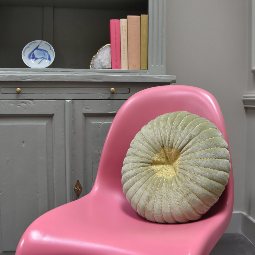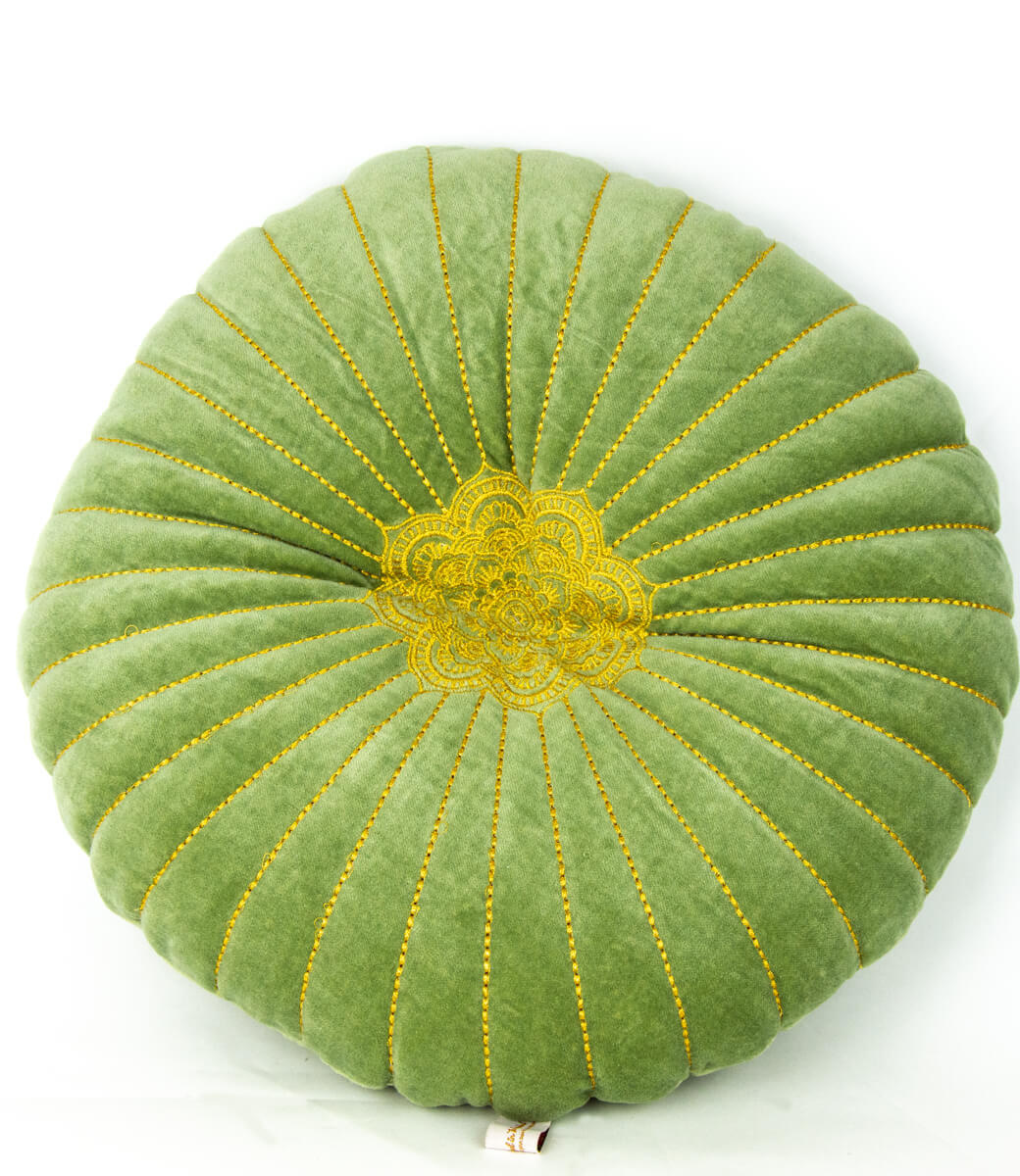 Handgefertigt in Indien und das Samtkissen trägt das Care Fair-Label. Es eignet sich auch ideal als Bodenkissen, und die Unterseite ist in derselben dunkelgrünen Farbe wie die Oberseite.