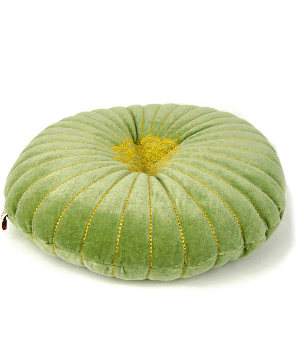 Für dieses wunderschöne orientalische runde Kissen wurde hochwertiger dunkelgrüner Samt verwendet. In einem Kürbisdesign mit einem Durchmesser von 40 cm und mit goldfarbenem Garn verziert. Grün und Gold sind eine äußerst beliebte Kombination, da die Farben sich sehr warm ergänzen. Das Kissen wird inklusive Füllung geliefert und ist sofort bereit, das Sofa zu schmücken.