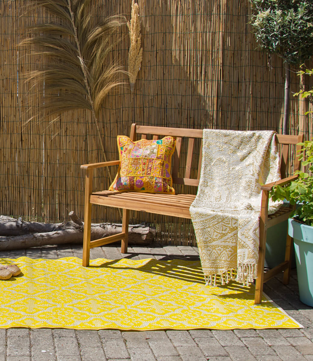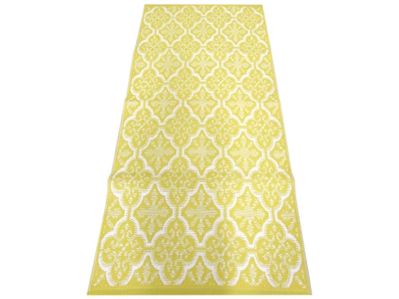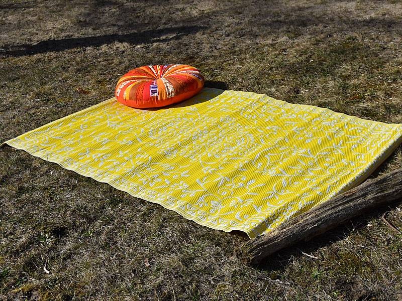 Ein gelbes und goldenes Outdoor-Teppich im orientalischen Stil. Ein wunderbarer Teppich für ein Picknick im Freien oder um Ihren Garten und Ihre Terrasse zu gestalten.Lesen Sie mehr