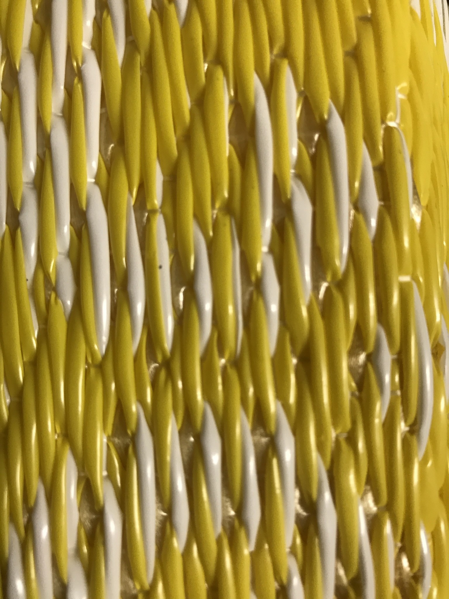Plastik Teppich in Gelb, Weiß und Gold im orientalischen Stil. Plastik-Teppich Handgefertigt, daher kann die Größe um 5 bis 10% abweichen. Picknick-Teppich in Gelb, Weiß und Gold.