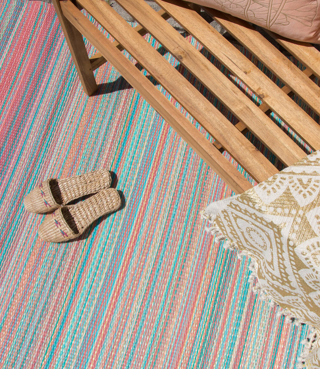 Ein outdoor teppich in Pastellfarben, die perfekte Farbkombination in einem Gartenteppich. Dieser Teppich lässt sich gut mit den bunten Matratzenkissen auf der Gartenbank kombinieren. Durch die sanften Farben verleiht dieser Teppich eine liebevolle Ausstrahlung.