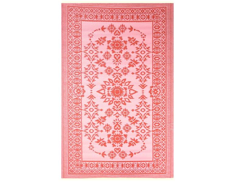 Ein Teppich in Pink und Rot, hergestellt aus Kunststoff. Ein Outdoor-Teppich, ideal für die Terrasse und leicht mit Wasser zu reinigen. Praktisch aufrollbar und leichtgewichtig, daher einfach mitzunehmen für Veranstaltungen, wenn das Gras noch feucht ist, um mit Freunden zu entspannen. Auch ein sehr schöner Teppich für das Kinderzimmer.