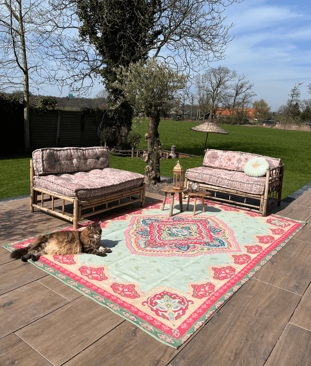 Das Original Mila ist eine unserer Lieblingsfarbkombinationen mit Gelb, Rosa, Blau und Grün, alles in einem fröhlichen orientalischen Design und in drei Größen erhältlich. Es ist ein allergikerfreundlicher Teppich und kann sowohl drinnen als auch draußen verwendet werden. Er schimmelt nicht unter der überdachung und fühlt sich wie Baumwolle an. Passende Kissen sind ebenfalls erhältlich.
