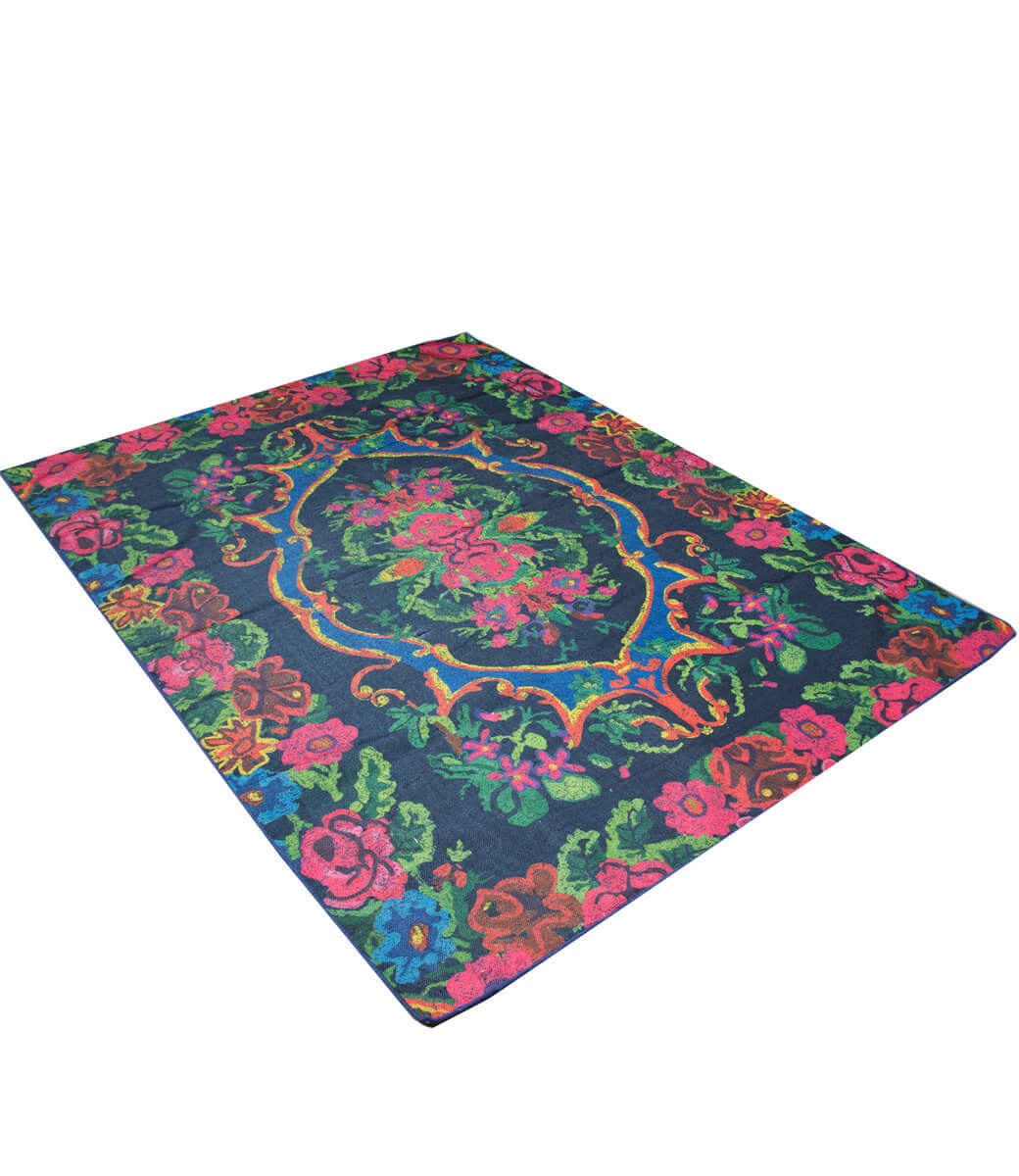 Outdoor teppich mit einem beeindruckenden Vintage-Rosenkelim-Muster, bei dem Schwarz die Hauptfarbe ist und ein farbenfrohes Rosenmuster darauf zu sehen ist. Im Garten können Sie dies als Teppich für die Gartengarnitur verwenden, um draußen ein richtiges Wohnzimmergefühl zu haben. Ein herrlich weicher Teppich, der sich anfühlt und aussieht wie Stoff, aber aus Polypropylen gefertigt ist. Ein vintage alter Teppich, so dass es so aussieht, als hätten Sie einen wirklich alten, authentischen Teppich liegen. Es gibt Fransen an den Seiten, die noch nicht auf dem Foto zu sehen sind, aber das verleiht dem Ganzen das gewisse Extra!