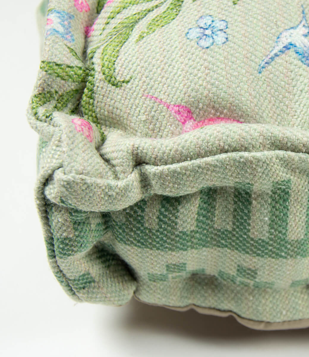 Palettenkissen mit fröhlichem Aufdruck mit Blumen und Vögeln. Ausgestattet mit einem sanften grünen Hintergrund und gemütlichen Pastellfarben. Ein Design speziell für Merel im Wunderland!Lesen Sie mehr