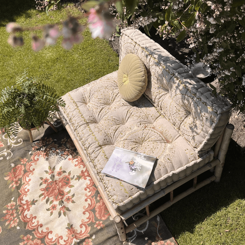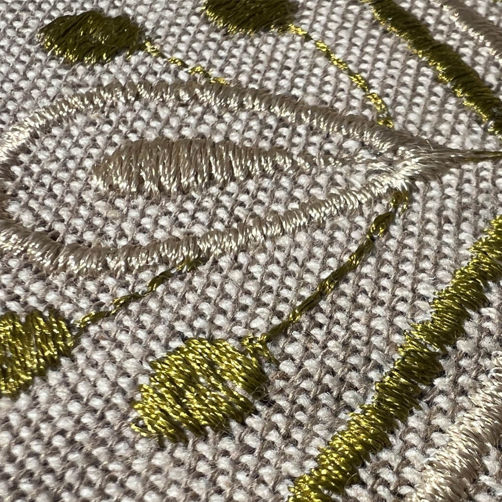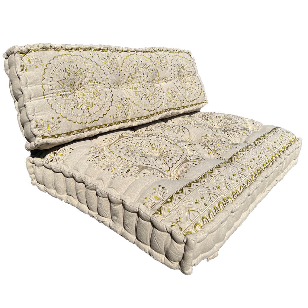 Pallet-Set mit ecru-farbenem Baumwolluntergrund und grünem Faden, wunderschöne Muster darauf gestickt, um einen Sitzbereich zu schaffen.Lesen Sie mehr