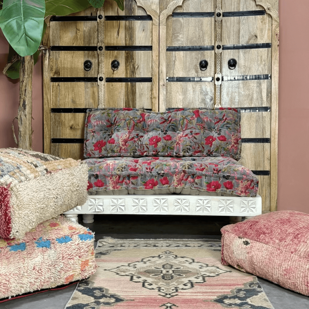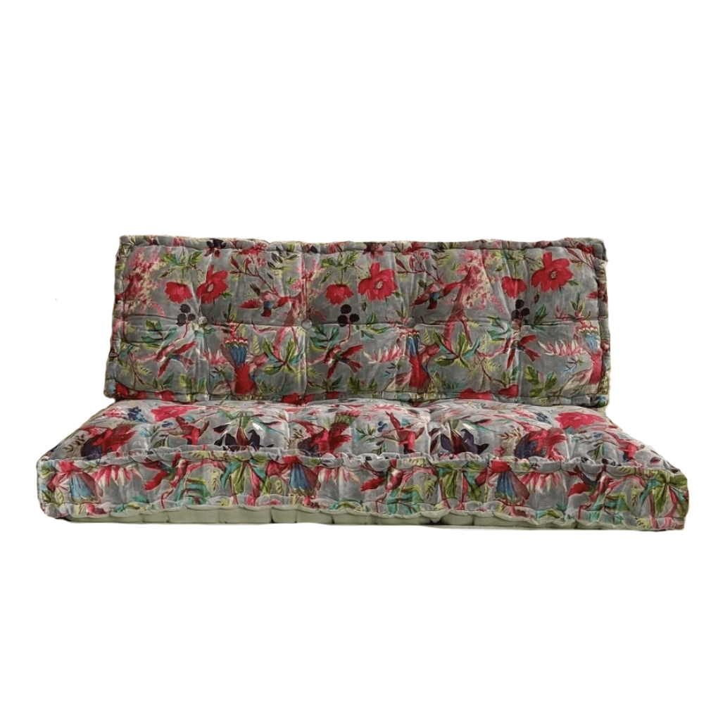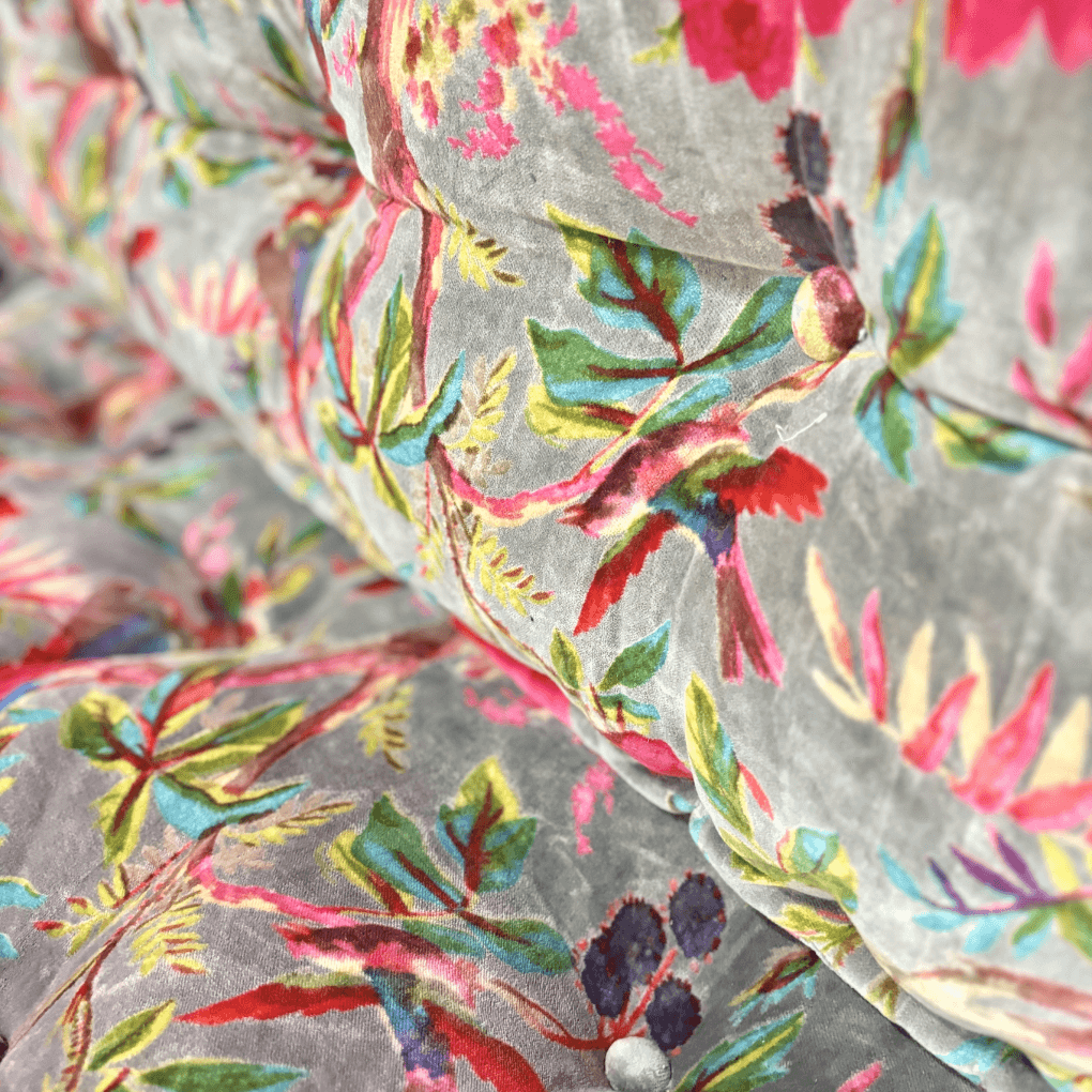 Pallettkissen mit einem stimmungsvollen Dschungel-Print. Das Kissen hat einen dunkelgrauen Hintergrund und wunderschöne farbige Blumen und Vögel. Das Produkt ist aus einem samtähnlichen Stoff gefertigt, was ihm ein elegantes Erscheinungsbild verleiht. Perfektes Accessoire für deinen Garten! Handgefertigt in Indien.